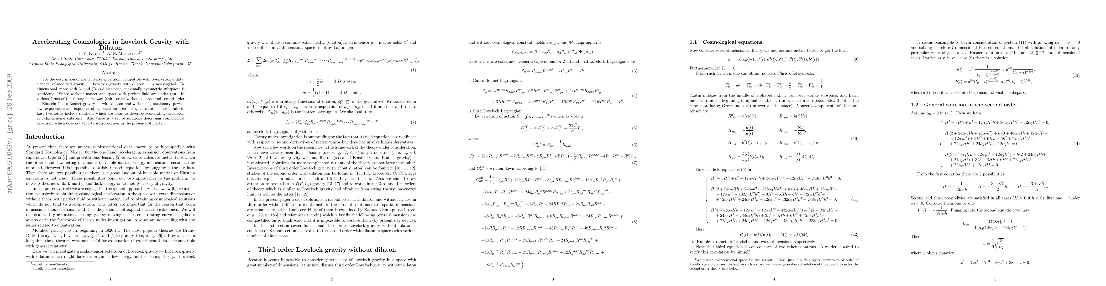 This paper explores accelerating cosmological models in Lovelock gravity with a dilaton, finding various forms of solutions including stationary, power-law, exponential, and exponent-of-exponent types, some of which describe the accelerating expansion of a 3-dimensional subspace without matter isotropization.