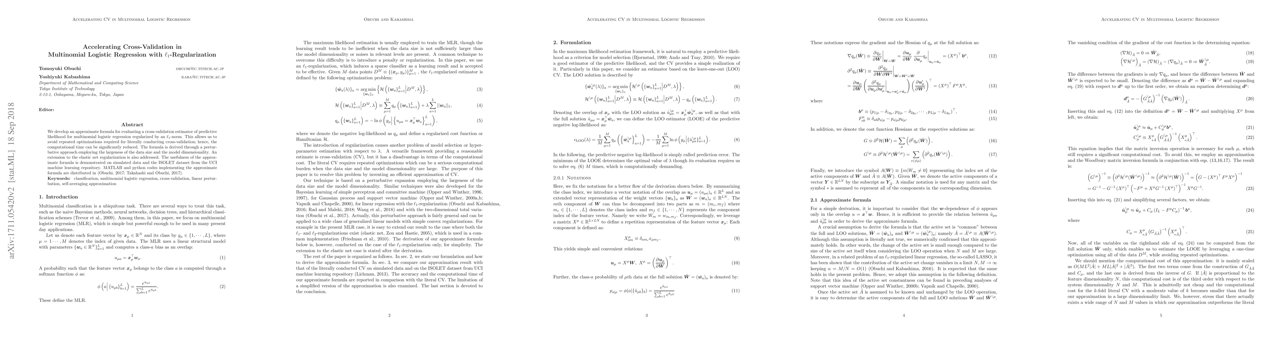 We develop an approximate formula for evaluating a cross-validation estimator of predictive likelihood for multinomial logistic regression regularized by an $\ell_1$-norm. This allows us to avoid repeated optimizations required for literally conducting cross-validation; hence, the computational time can be significantly reduced. The formula is derived through a perturbative approach employing the largeness of the data size and the model dimensionality. An extension to the elastic net regularization is also addressed. The usefulness of the approximate formula is demonstrated on simulated data and the ISOLET dataset from the UCI machine learning repository.