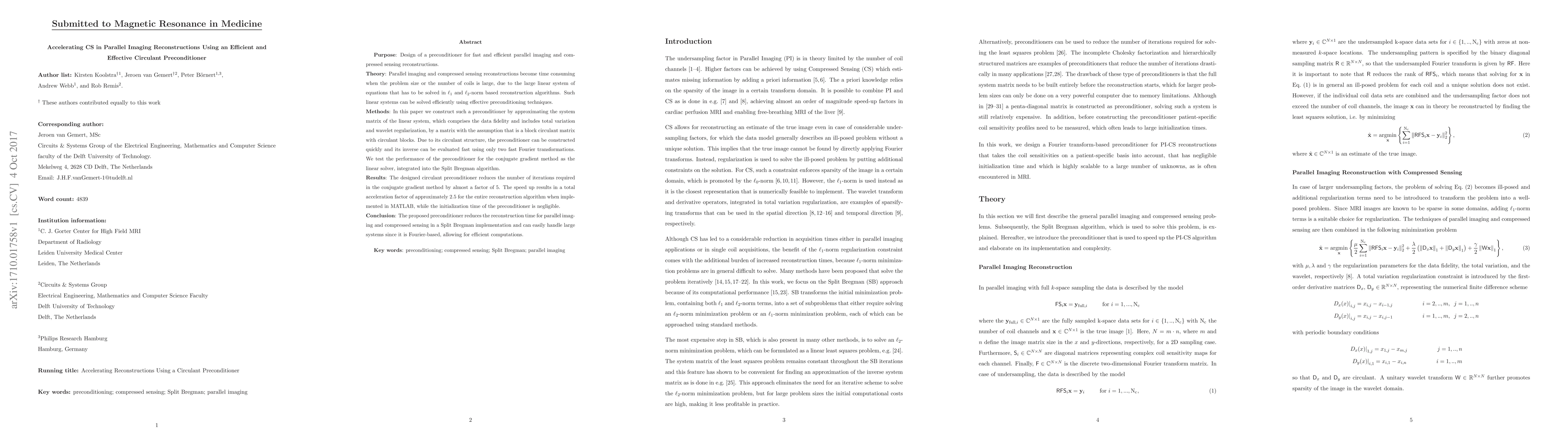 Purpose: Design of a preconditioner for fast and efficient parallel imaging and compressed sensing reconstructions. Theory: Parallel imaging and compressed sensing reconstructions become time consuming when the problem size or the number of coils is large, due to the large linear system of equations that has to be solved in l_1 and l_2-norm based reconstruction algorithms. Such linear systems can be solved efficiently using effective preconditioning techniques. Methods: In this paper we construct such a preconditioner by approximating the system matrix of the linear system, which comprises the data fidelity and includes total variation and wavelet regularization, by a matrix with the assumption that is a block circulant matrix with circulant blocks. Due to its circulant structure, the preconditioner can be constructed quickly and its inverse can be evaluated fast using only two fast Fourier transformations. We test the performance of the preconditioner for the conjugate gradient method as the linear solver, integrated into the Split Bregman algorithm. Results: The designed circulant preconditioner reduces the number of iterations required in the conjugate gradient method by almost a factor of~5. The speed up results in a total acceleration factor of approximately 2.5 for the entire reconstruction algorithm when implemented in MATLAB, while the initialization time of the preconditioner is negligible. Conclusion: The proposed preconditioner reduces the reconstruction time for parallel imaging and compressed sensing in a Split Bregman implementation and can easily handle large systems since it is Fourier-based, allowing for efficient computations. Key words: preconditioning; compressed sensing; Split Bregman; parallel imaging