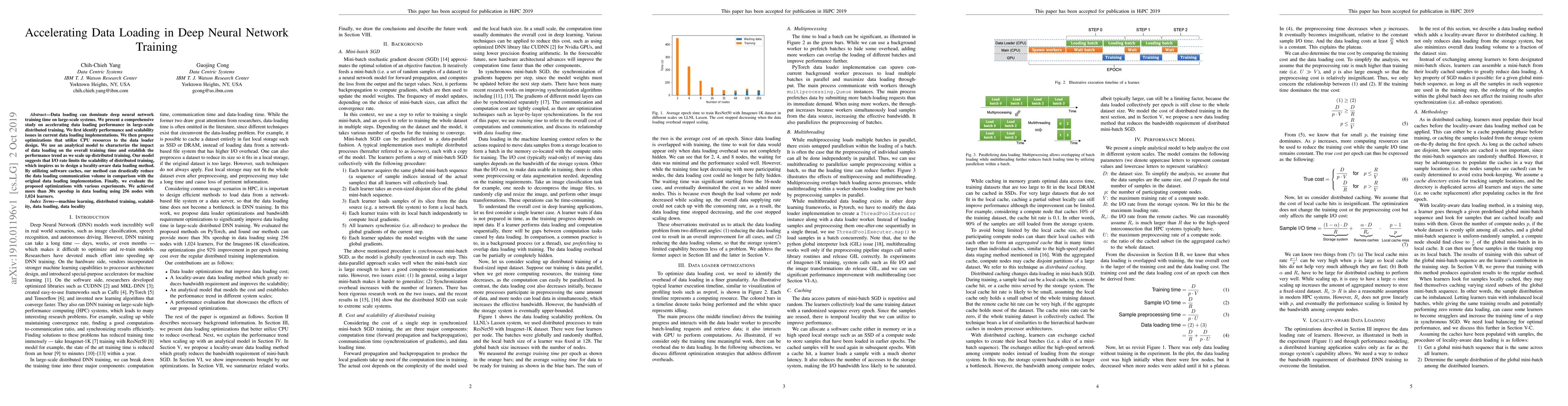 This paper investigates methods to accelerate data loading in large-scale distributed deep neural network training, identifying I/O bottlenecks and proposing optimizations to utilize CPU resources and software caches. Experiments show a more than 30x speedup in data loading across 256 nodes.