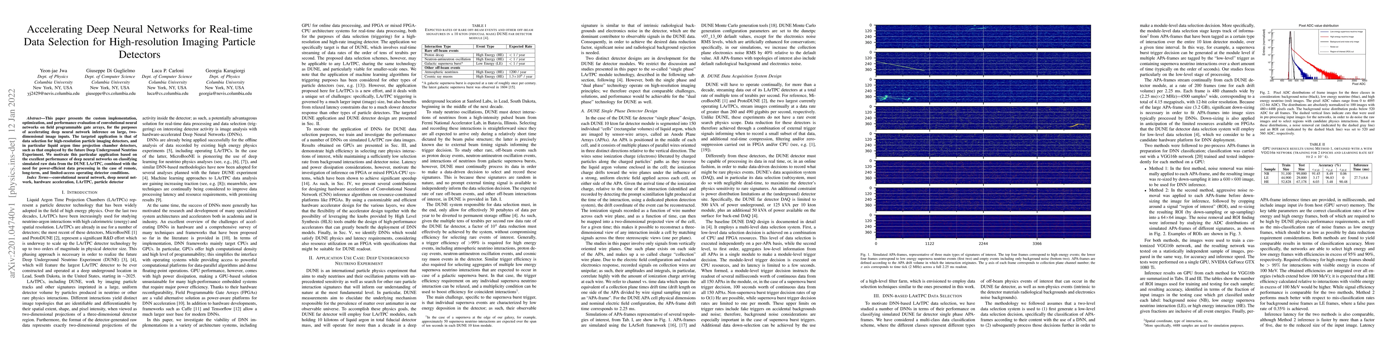 This paper presents the custom implementation, optimization, and performance evaluation of convolutional neural networks on field programmable gate arrays, for the purposes of accelerating deep neural network inference on large, two-dimensional image inputs. The targeted application is that of data selection for high-resolution particle imaging detectors, and in particular liquid argon time projection chamber detectors, such as that employed by the future Deep Underground Neutrino Experiment. We motivate this particular application based on the excellent performance of deep neural networks on classifying simulated raw data from the DUNE LArTPC, combined with the need for power-efficient data processing in the case of remote, long-term, and limited-access operating detector conditions.