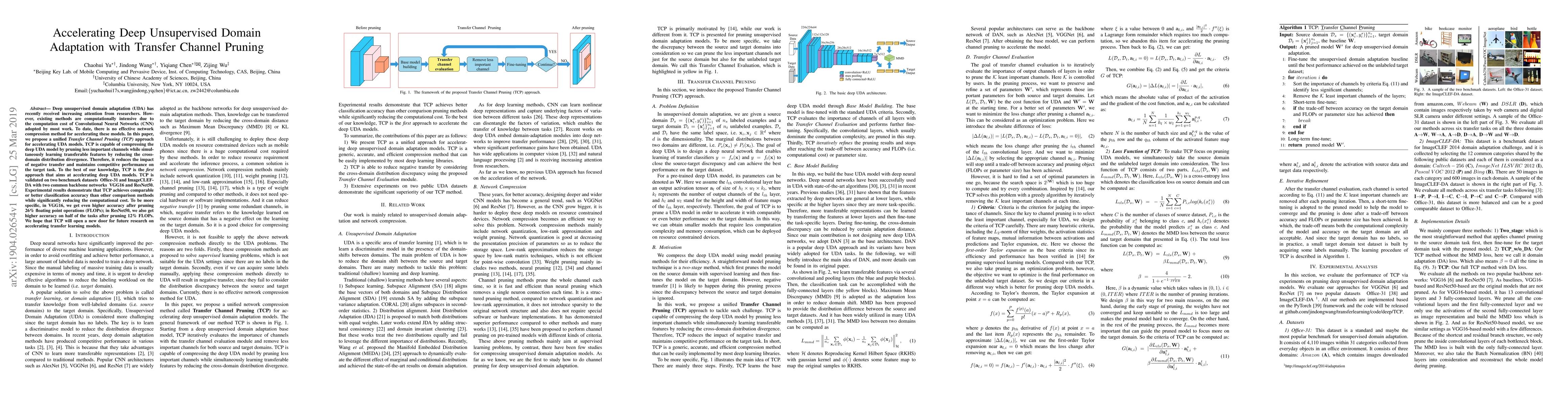This paper proposes Transfer Channel Pruning (TCP) to accelerate deep unsupervised domain adaptation (UDA) models by compressing them through pruning less important channels, thereby reducing computational costs while maintaining or improving classification accuracy. TCP is validated on Office-31 and ImageCLEF-DA datasets, showing competitive performance with significant reductions in computational load.