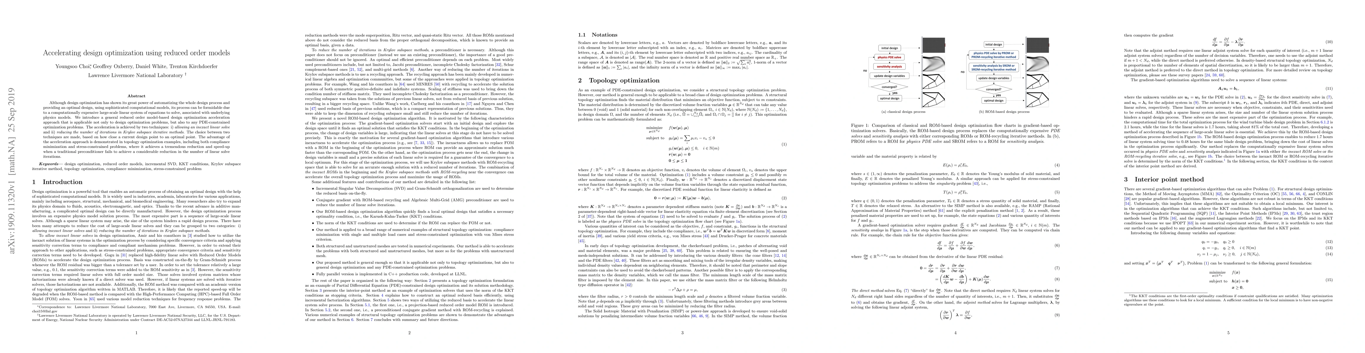 Although design optimization has shown its great power of automatizing the whole design process and providing an optimal design, using sophisticated computational models, its process can be formidable due to a computationally expensive large-scale linear system of equations to solve, associated with underlying physics models. We introduce a general reduced order model-based design optimization acceleration approach that is applicable not only to design optimization problems, but also to any PDE-constrained optimization problems. The acceleration is achieved by two techniques: i) allowing an inexact linear solve and ii) reducing the number of iterations in Krylov subspace iterative methods. The choice between two techniques are made, based on how close a current design point to an optimal point. The advantage of the acceleration approach is demonstrated in topology optimization examples, including both compliance minimization and stress-constrained problems, where it achieves a tremendous reduction and speed-up when a traditional preconditioner fails to achieve a considerable reduction in the number of linear solve iterations.