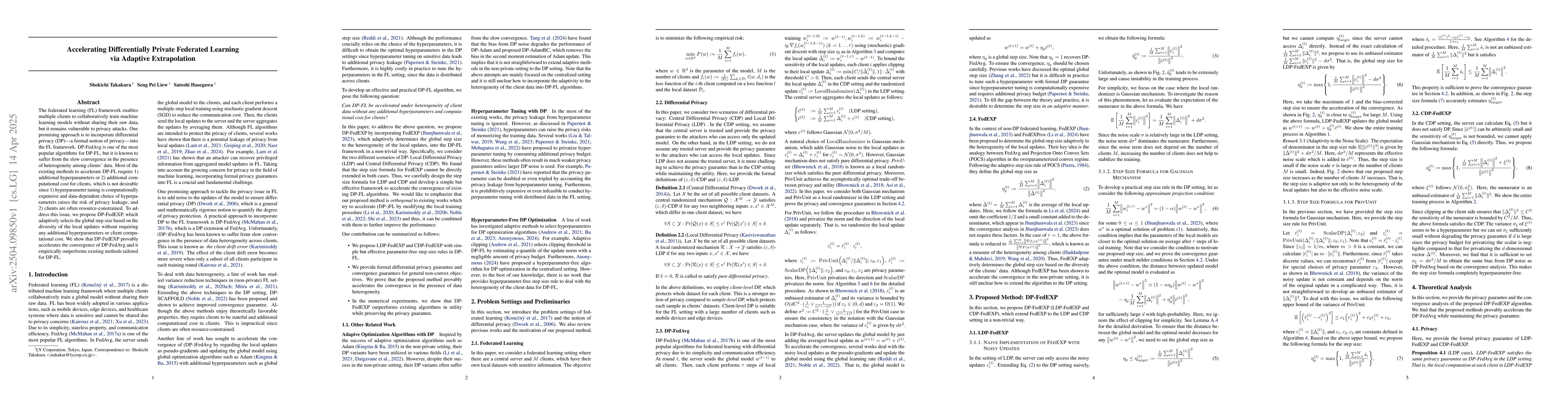 The paper proposes DP-FedEXP, a method to accelerate differentially private federated learning by adaptively selecting the global step size based on local update diversity, without additional hyperparameters or computational costs. DP-FedEXP provably accelerates the convergence of DP-FedAvg and empirically outperforms existing methods.