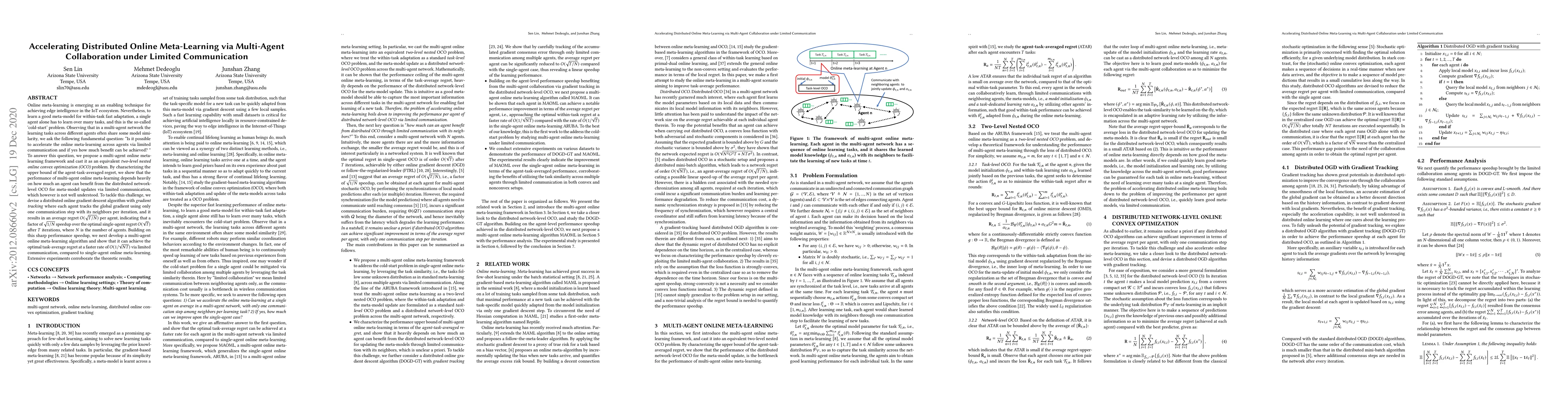 This paper proposes a multi-agent online meta-learning framework to address the 'cold-start' problem in distributed settings, leveraging limited communication. It introduces a distributed online gradient descent algorithm with gradient tracking, achieving a $\sqrt{1/N}$ speedup over single-agent methods, and demonstrates optimal task-average regret at a faster rate via limited communication.