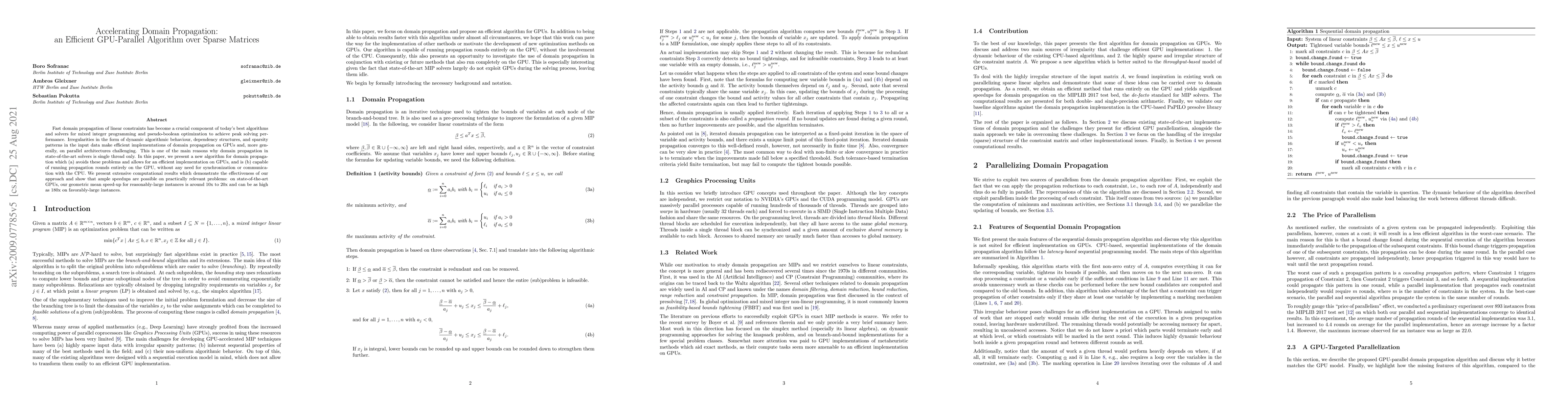 Fast domain propagation of linear constraints has become a crucial component of today's best algorithms and solvers for mixed integer programming and pseudo-boolean optimization to achieve peak solving performance. Irregularities in the form of dynamic algorithmic behaviour, dependency structures, and sparsity patterns in the input data make efficient implementations of domain propagation on GPUs and, more generally, on parallel architectures challenging. This is one of the main reasons why domain propagation in state-of-the-art solvers is single thread only. In this paper, we present a new algorithm for domain propagation which (a) avoids these problems and allows for an efficient implementation on GPUs, and is (b) capable of running propagation rounds entirely on the GPU, without any need for synchronization or communication with the CPU. We present extensive computational results which demonstrate the effectiveness of our approach and show that ample speedups are possible on practically relevant problems: on state-of-the-art GPUs, our geometric mean speed-up for reasonably-large instances is around 10x to 20x and can be as high as 180x on favorably-large instances.