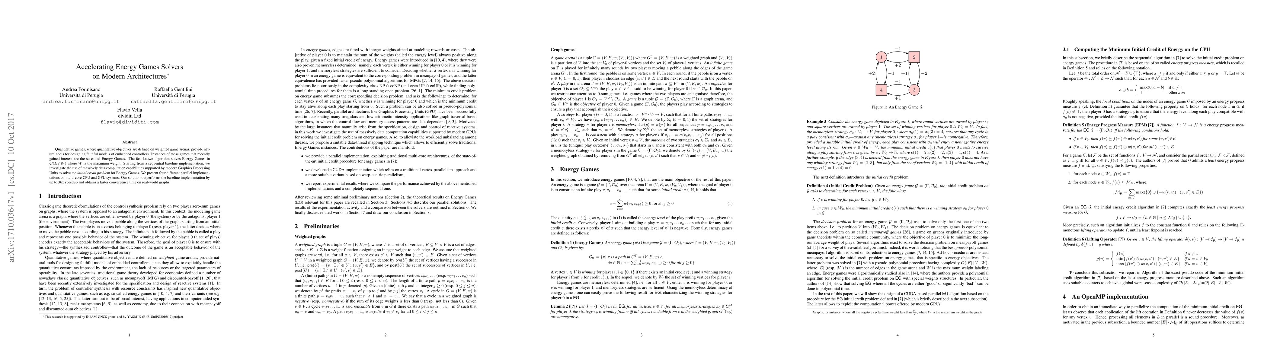 Quantitative games, where quantitative objectives are defined on weighted game arenas, provide natural tools for designing faithful models of embedded controllers. Instances of these games that recently gained interest are the so called Energy Games. The fast-known algorithm solves Energy Games in O(EVW) where W is the maximum weight. Starting from a sequential baseline implementation, we investigate the use of massively data computation capabilities supported by modern Graphics Processing Units to solve the `initial credit problem' for Energy Games. We present four different parallel implementations on multi-core CPU and GPU systems. Our solution outperforms the baseline implementation by up to 36x speedup and obtains a faster convergence time on real-world graphs.