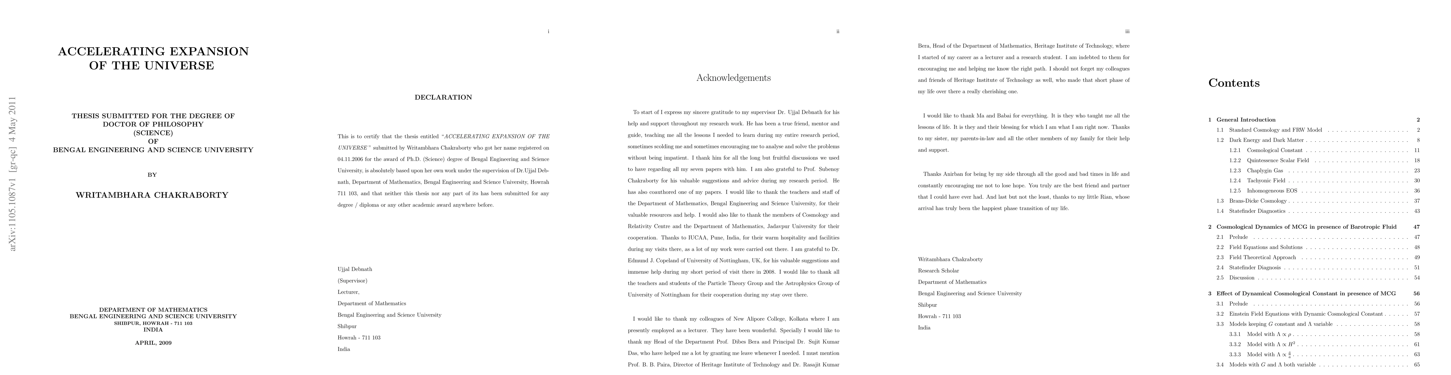 This thesis explores models of accelerated expansion in the universe, including modified Chaplygin gas, barotropic fluid, and scalar fields, to understand the nature of dark energy and its role in the cosmos.