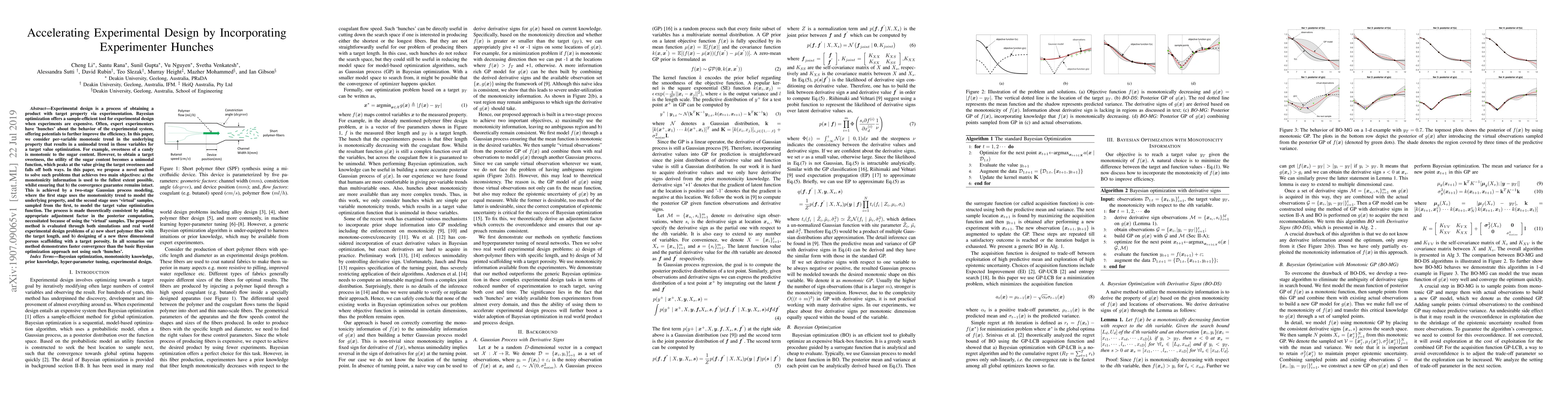 This paper introduces a novel method for experimental design that leverages expert 'hunches' about system behavior, specifically monotonic trends. It uses a two-stage Gaussian process modeling, incorporating 'virtual' samples to optimize target value. The approach ensures efficient convergence and outperforms basic Bayesian optimization in simulations and real-world scenarios, like designing polymer fibers and scaffolding.