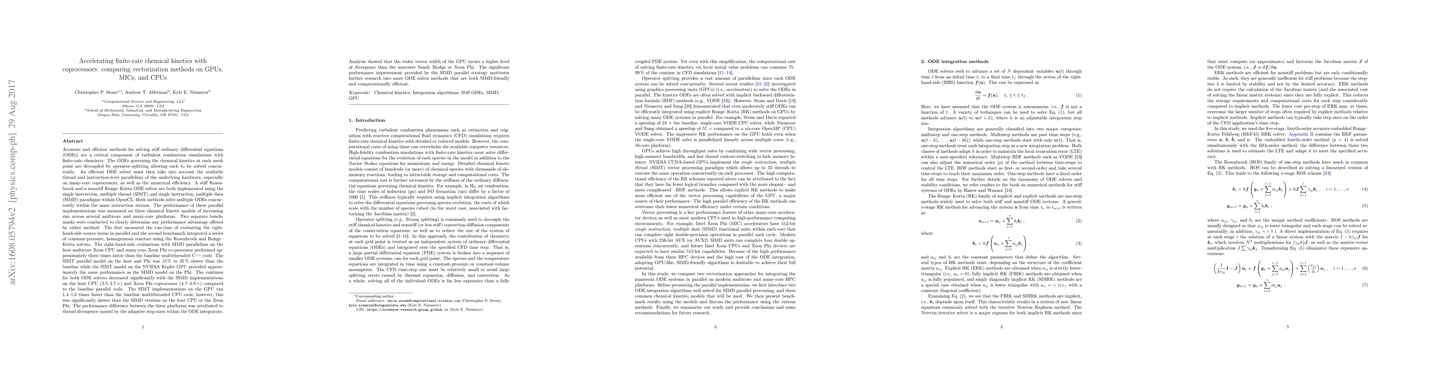 This paper compares the efficiency of vectorization methods for solving finite-rate chemical kinetics on GPUs, MICs, and CPUs using SIMD and SIMT paradigms. The SIMD approach on multicore CPUs and Xeon Phi coprocessors significantly outperformed baseline multithreaded code, while SIMT on GPUs was slower due to thread divergence issues.