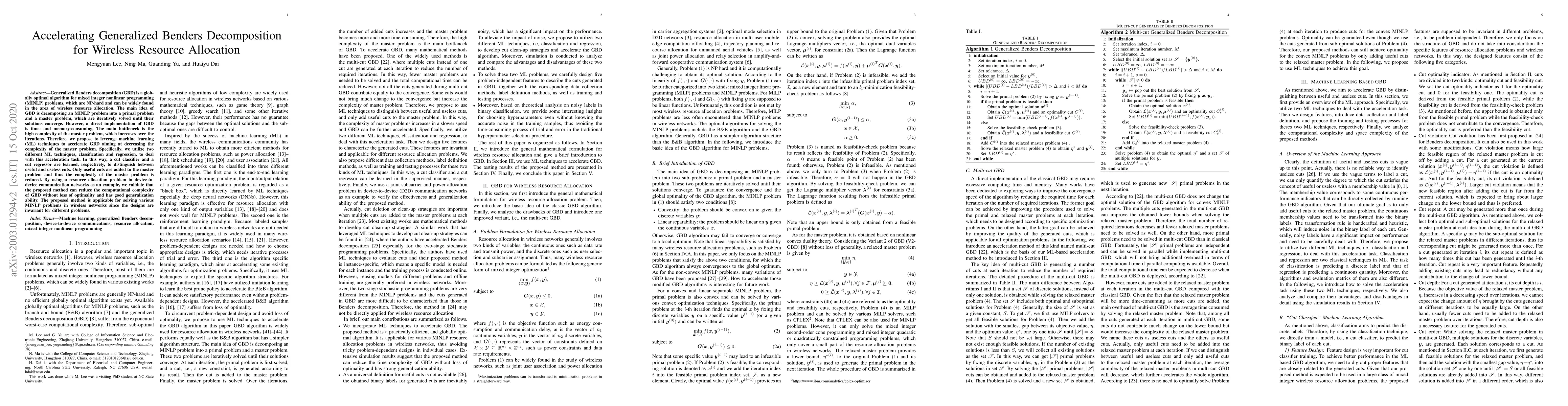 Researchers accelerate generalized Benders decomposition for wireless resource allocation by leveraging machine learning techniques to reduce the complexity of the master problem, achieving computational efficiency without losing optimality.