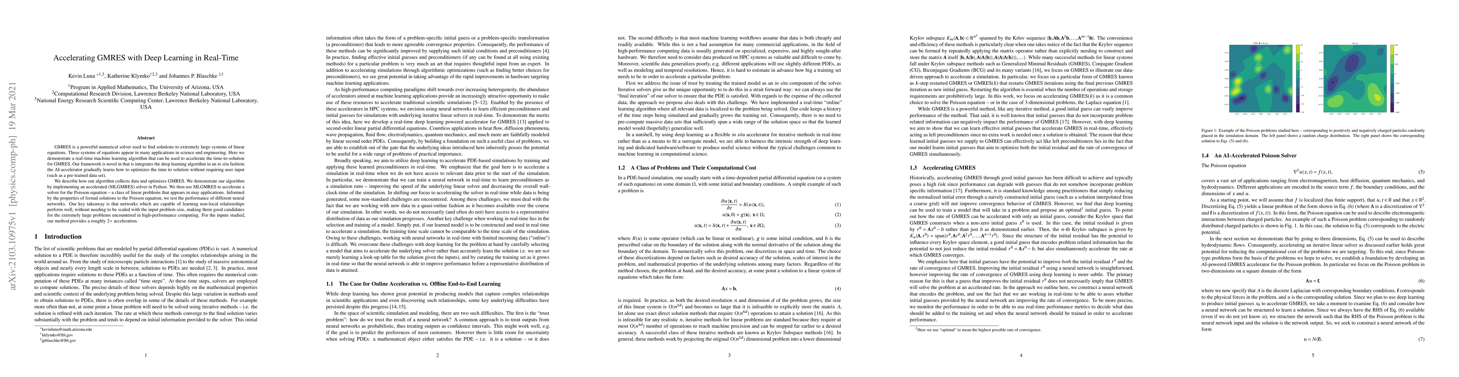GMRES is a powerful numerical solver used to find solutions to extremely large systems of linear equations. These systems of equations appear in many applications in science and engineering. Here we demonstrate a real-time machine learning algorithm that can be used to accelerate the time-to-solution for GMRES. Our framework is novel in that is integrates the deep learning algorithm in an in situ fashion: the AI-accelerator gradually learns how to optimizes the time to solution without requiring user input (such as a pre-trained data set). We describe how our algorithm collects data and optimizes GMRES. We demonstrate our algorithm by implementing an accelerated (MLGMRES) solver in Python. We then use MLGMRES to accelerate a solver for the Poisson equation -- a class of linear problems that appears in may applications. Informed by the properties of formal solutions to the Poisson equation, we test the performance of different neural networks. Our key takeaway is that networks which are capable of learning non-local relationships perform well, without needing to be scaled with the input problem size, making them good candidates for the extremely large problems encountered in high-performance computing. For the inputs studied, our method provides a roughly 2$\times$ acceleration.
