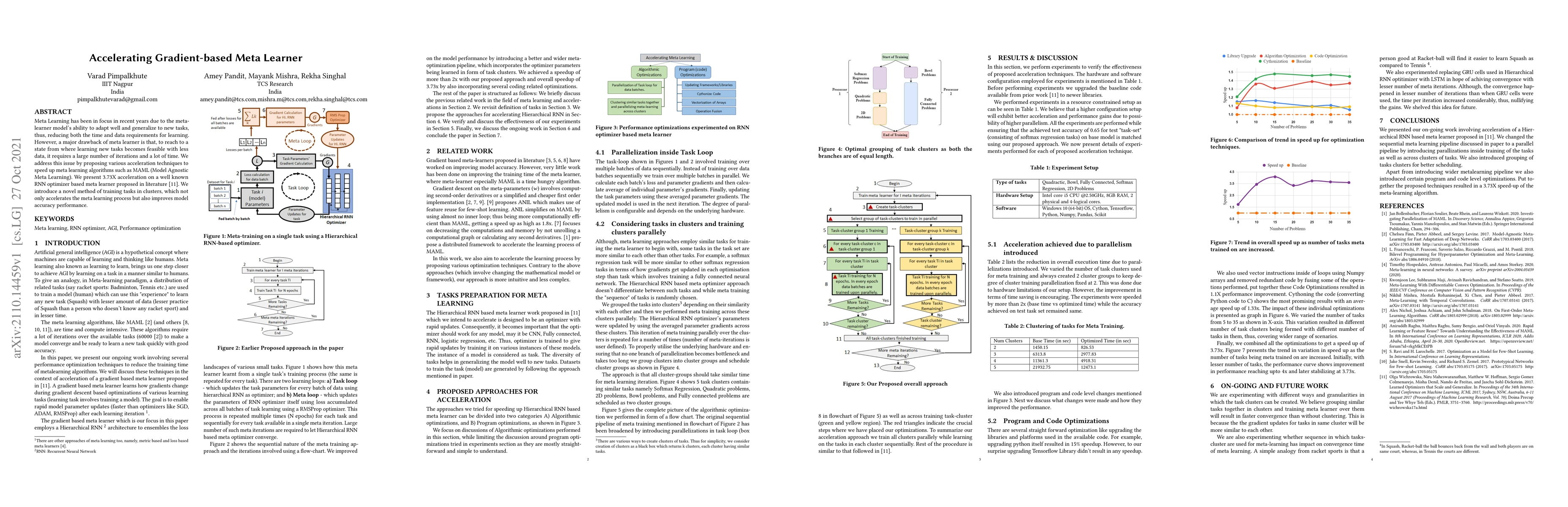 Meta Learning has been in focus in recent years due to the meta-learner model's ability to adapt well and generalize to new tasks, thus, reducing both the time and data requirements for learning. However, a major drawback of meta learner is that, to reach to a state from where learning new tasks becomes feasible with less data, it requires a large number of iterations and a lot of time. We address this issue by proposing various acceleration techniques to speed up meta learning algorithms such as MAML (Model Agnostic Meta Learning). We present 3.73X acceleration on a well known RNN optimizer based meta learner proposed in literature [11]. We introduce a novel method of training tasks in clusters, which not only accelerates the meta learning process but also improves model accuracy performance. Keywords: Meta learning, RNN optimizer, AGI, Performance optimization
