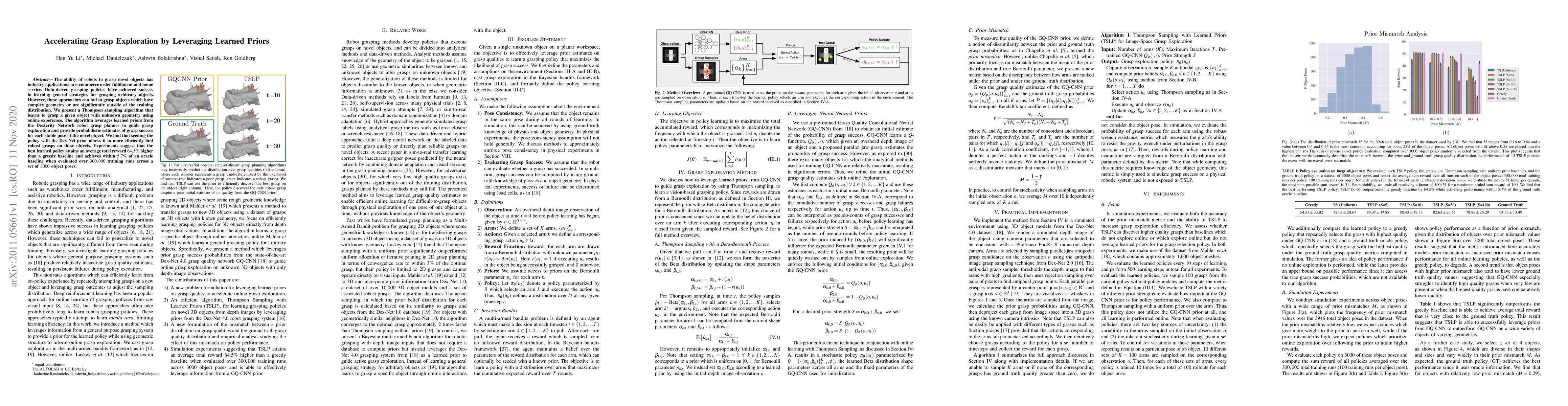 This paper proposes a Thompson sampling algorithm to enhance robot grasp exploration for novel objects by utilizing prior knowledge from the Dexterity Network. The approach achieves better grasp success rates and efficiency compared to baselines, demonstrating a 64.5% improvement over a greedy method and near-optimal performance.
