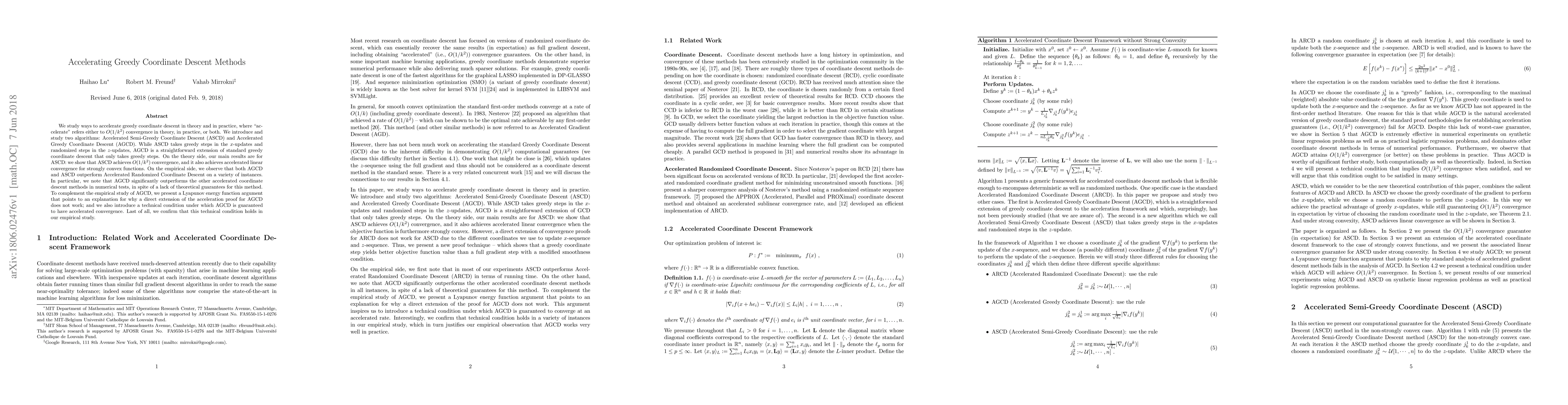 This paper proposes two accelerated greedy coordinate descent algorithms, ASCD and AGCD, achieving $O(1/k^2)$ convergence theoretically for ASCD and empirically outperforming other methods. AGCD lacks theoretical guarantees but shows strong empirical performance, with a technical condition identified for its accelerated convergence.