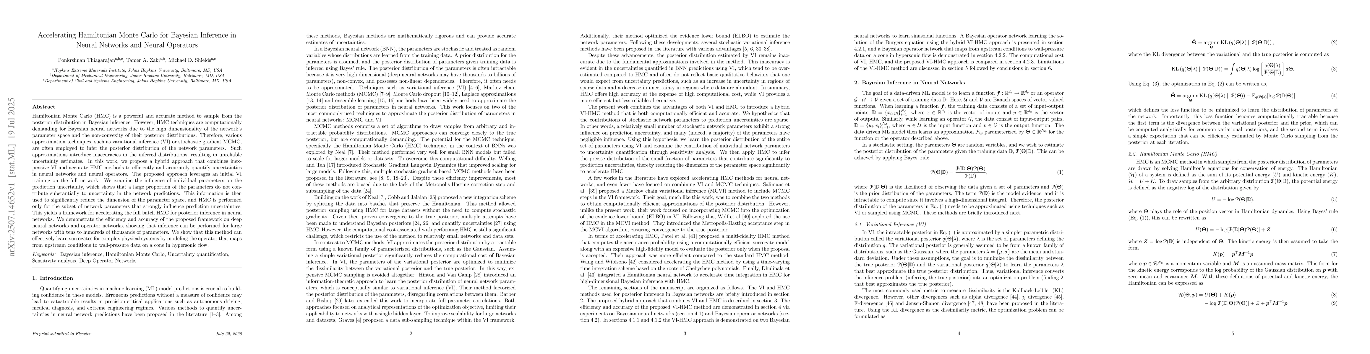 Hamiltonian Monte Carlo (HMC) is a powerful and accurate method to sample from the posterior distribution in Bayesian inference. However, HMC techniques are computationally demanding for Bayesian neural networks due to the high dimensionality of the network's parameter space and the non-convexity of their posterior distributions. Therefore, various approximation techniques, such as variational inference (VI) or stochastic gradient MCMC, are often employed to infer the posterior distribution of the network parameters. Such approximations introduce inaccuracies in the inferred distributions, resulting in unreliable uncertainty estimates. In this work, we propose a hybrid approach that combines inexpensive VI and accurate HMC methods to efficiently and accurately quantify uncertainties in neural networks and neural operators. The proposed approach leverages an initial VI training on the full network. We examine the influence of individual parameters on the prediction uncertainty, which shows that a large proportion of the parameters do not contribute substantially to uncertainty in the network predictions. This information is then used to significantly reduce the dimension of the parameter space, and HMC is performed only for the subset of network parameters that strongly influence prediction uncertainties. This yields a framework for accelerating the full batch HMC for posterior inference in neural networks. We demonstrate the efficiency and accuracy of the proposed framework on deep neural networks and operator networks, showing that inference can be performed for large networks with tens to hundreds of thousands of parameters. We show that this method can effectively learn surrogates for complex physical systems by modeling the operator that maps from upstream conditions to wall-pressure data on a cone in hypersonic flow.