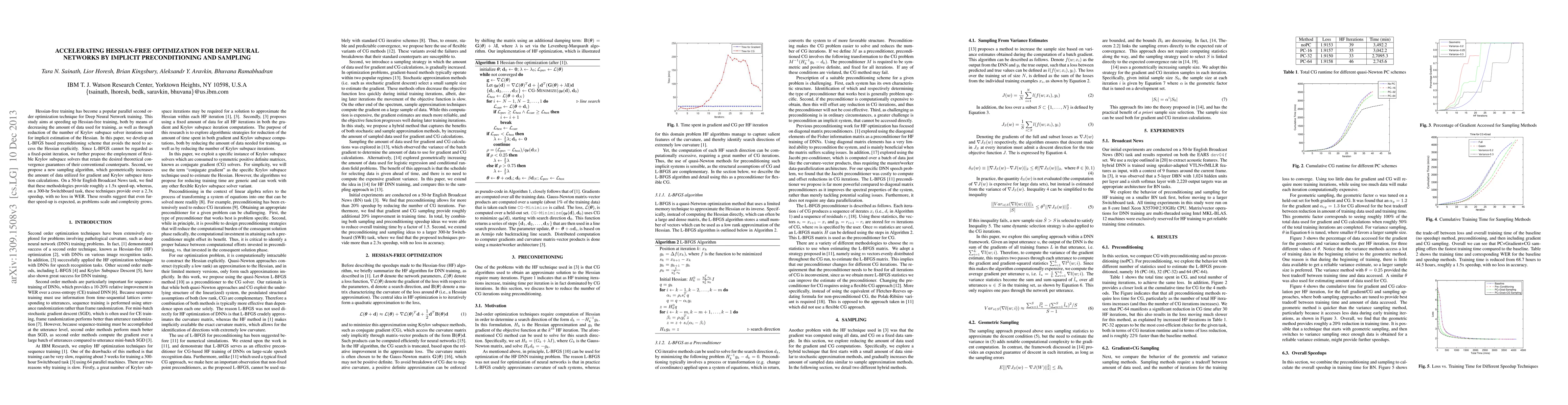 This paper proposes an L-BFGS based preconditioning scheme and a new sampling algorithm to accelerate Hessian-free optimization for deep neural networks, achieving significant speedups on large-scale tasks without compromising performance.