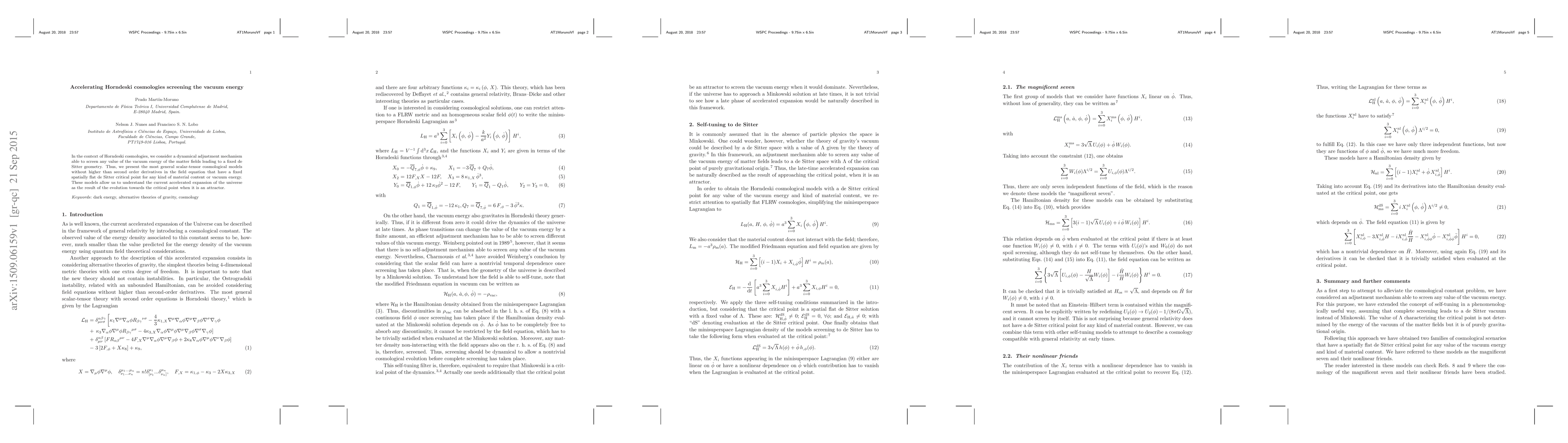 This paper explores Horndeski cosmologies with a dynamical mechanism that screens vacuum energy, resulting in a fixed de Sitter geometry. It presents general scalar-tensor models that exhibit a spatially flat de Sitter critical point, explaining the universe's accelerated expansion as an attractor towards this point.