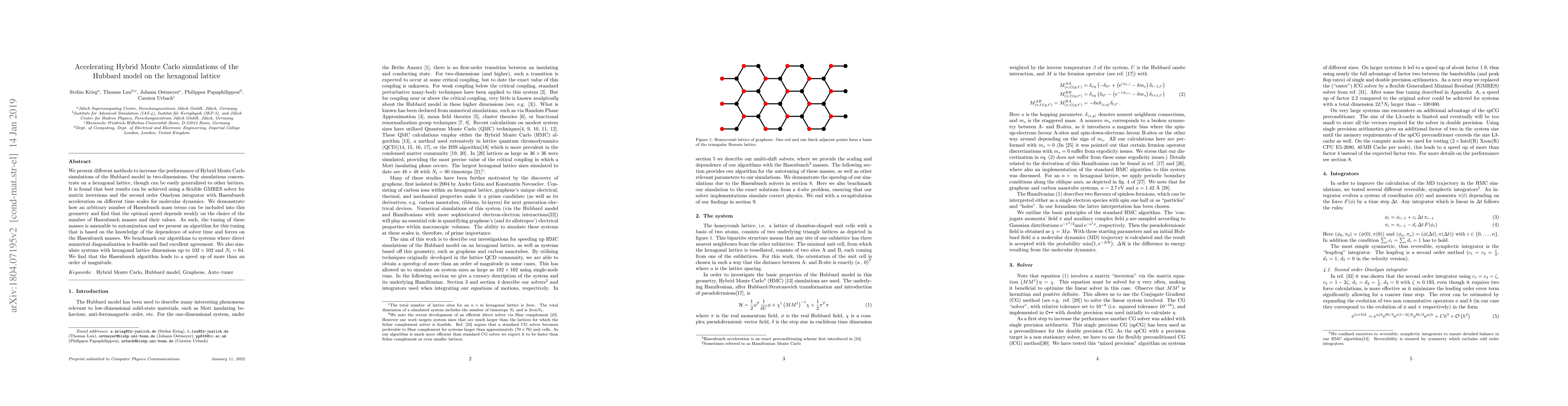 This paper presents methods to enhance the efficiency of Hybrid Monte Carlo simulations for the Hubbard model on a hexagonal lattice, achieving significant speedups using a flexible GMRES solver and the second-order Omelyan integrator with Hasenbusch acceleration. The optimal performance is found to depend weakly on the number and values of Hasenbusch masses, allowing for automated tuning.