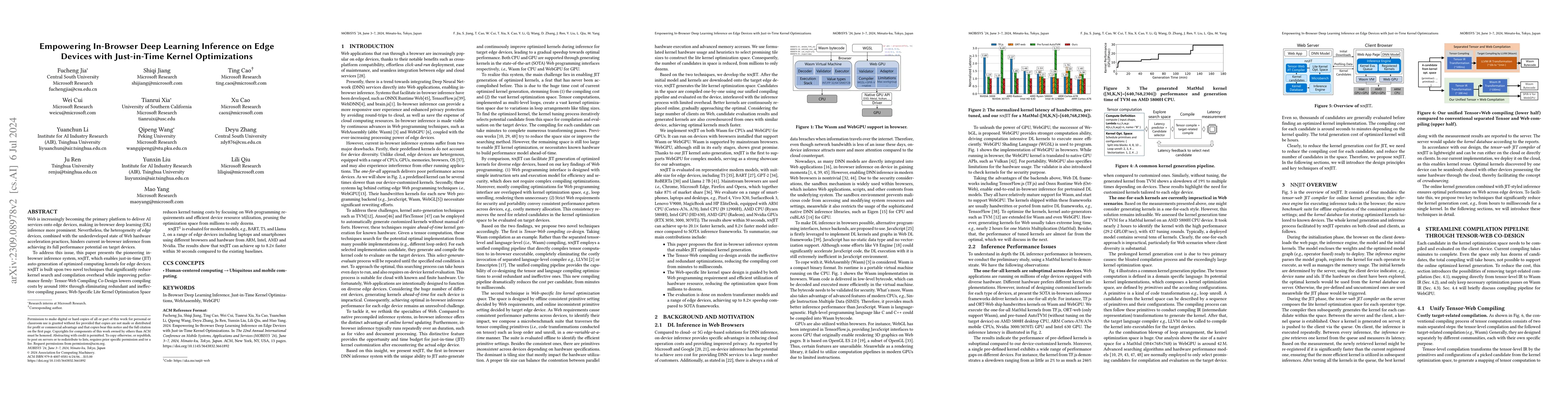 This paper introduces nn-JIT.web, an in-browser deep learning inference system that employs just-in-time kernel optimizations to enhance performance on diverse edge devices. It utilizes two novel web programming techniques to significantly reduce kernel generation time and improve performance.