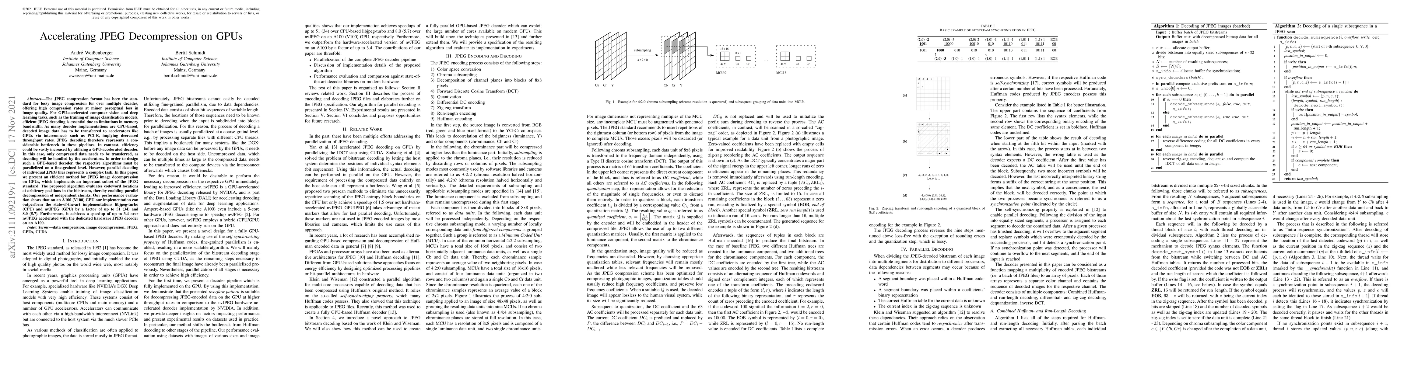 This paper presents an efficient method for JPEG image decompression on GPUs, achieving significant speedups over existing CPU-based and GPU-based implementations, with performance gains of up to 51 times and 3.4 times.