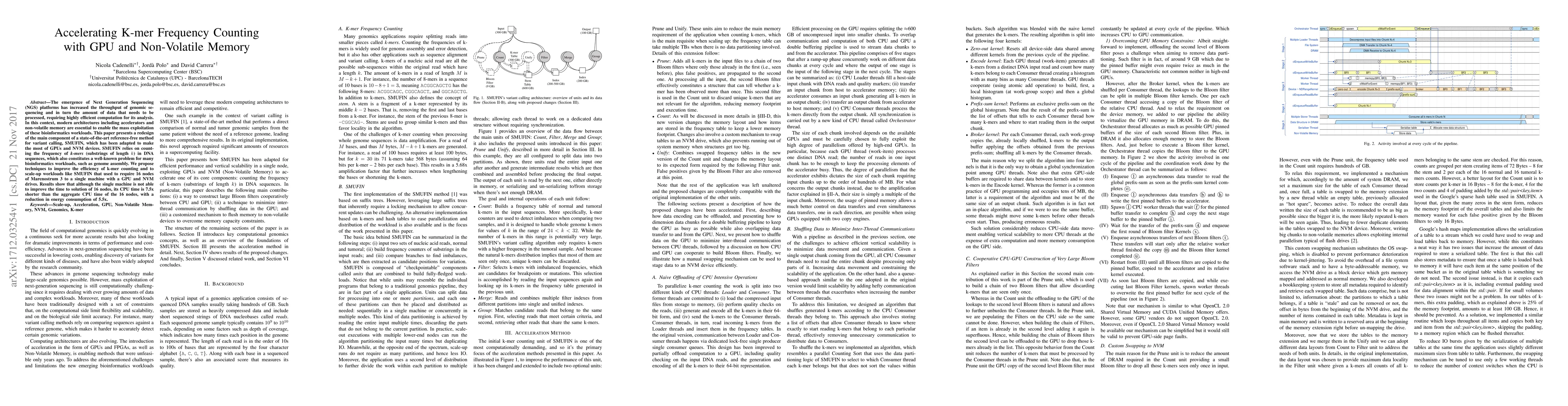 The emergence of Next Generation Sequencing (NGS) platforms has increased the throughput of genomic sequencing and in turn the amount of data that needs to be processed, requiring highly efficient computation for its analysis. In this context, modern architectures including accelerators and non-volatile memory are essential to enable the mass exploitation of these bioinformatics workloads. This paper presents a redesign of the main component of a state-of-the-art reference-free method for variant calling, SMUFIN, which has been adapted to make the most of GPUs and NVM devices. SMUFIN relies on counting the frequency of \textit{k-mers} (substrings of length $k$) in DNA sequences, which also constitutes a well-known problem for many bioinformatics workloads, such as genome assembly. We propose techniques to improve the efficiency of k-mer counting and to scale-up workloads like \sm that used to require 16 nodes of \mn to a single machine with a GPU and NVM drives. Results show that although the single machine is not able to improve the time to solution of 16 nodes, its CPU time is 7.5x shorter than the aggregate CPU time of the 16 nodes, with a reduction in energy consumption of 5.5x.