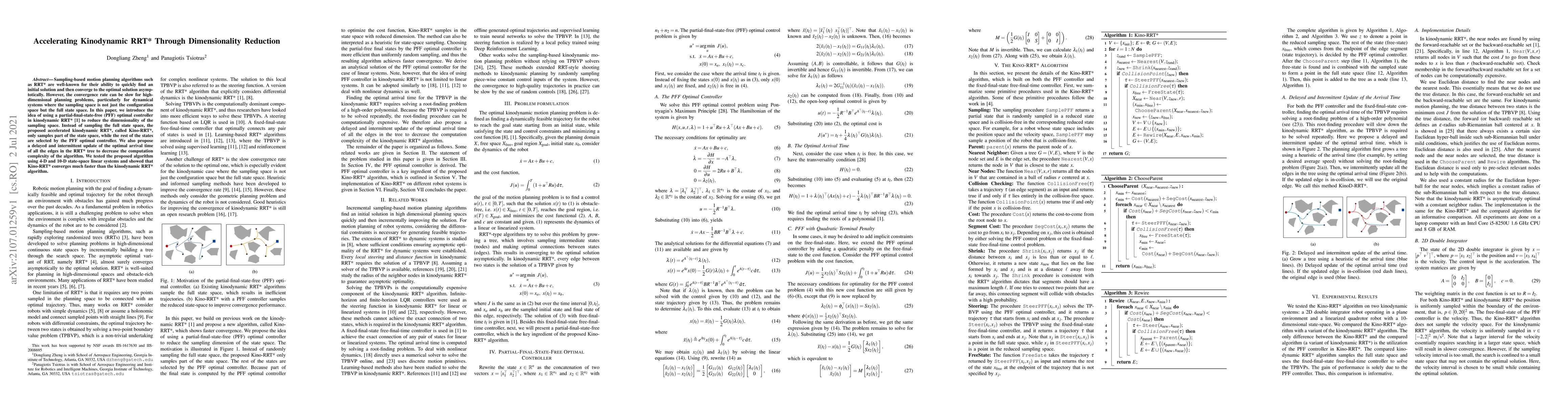 The paper presents Kino-RRT*, an enhanced kinodynamic RRT* algorithm that incorporates a PFF optimal controller and delayed, intermittent updates of the optimal arrival time, leading to faster convergence and improved performance.