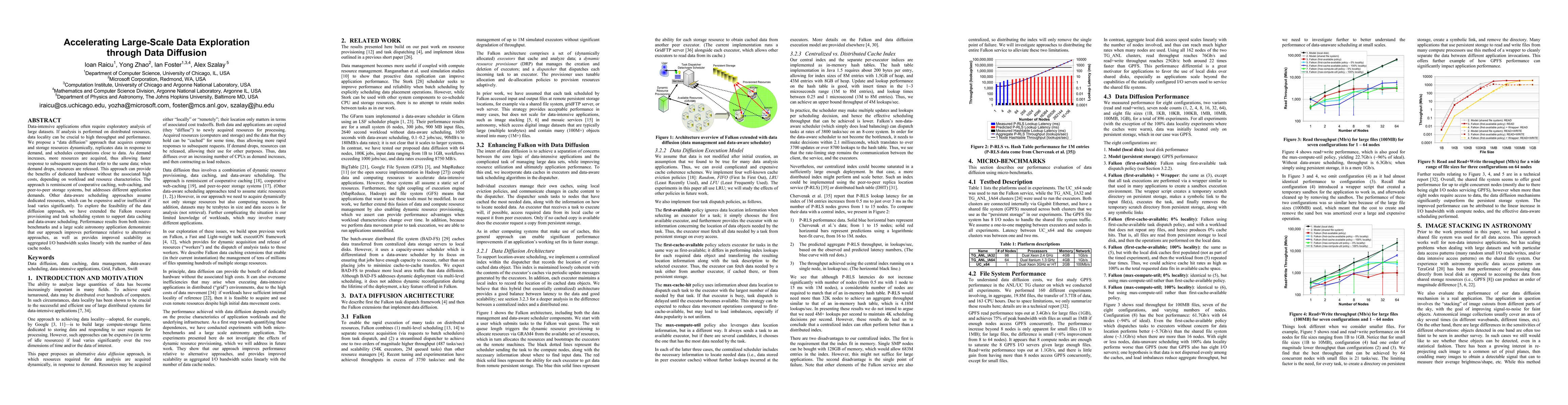 This paper proposes a "data diffusion" approach to dynamically acquire compute and storage resources, replicate data based on demand, and schedule computations near data to enhance performance in large-scale data exploration. The method improves scalability and performance, as demonstrated by extending the Falkon system and tested through micro-benchmarks and a large-scale astronomy application.