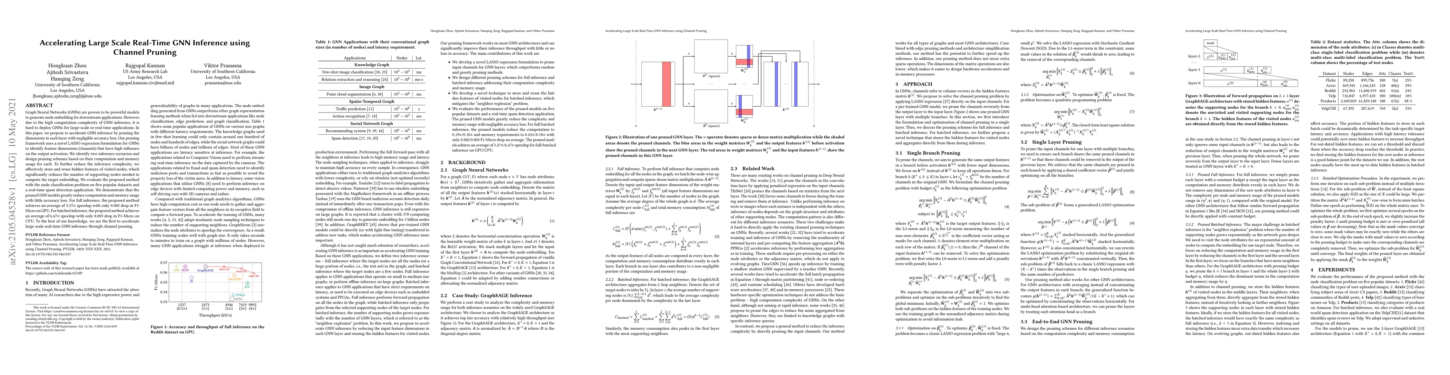 This paper proposes a method to accelerate large-scale real-time Graph Neural Network (GNN) inference by pruning dimensions with minimal accuracy loss. The authors use LASSO regression to identify influential feature dimensions and design pruning schemes tailored to different inference scenarios. They achieve significant speedups with minimal loss in accuracy, demonstrating up to 6.67x speedup in batched inference with only minor F1-Micro drop.