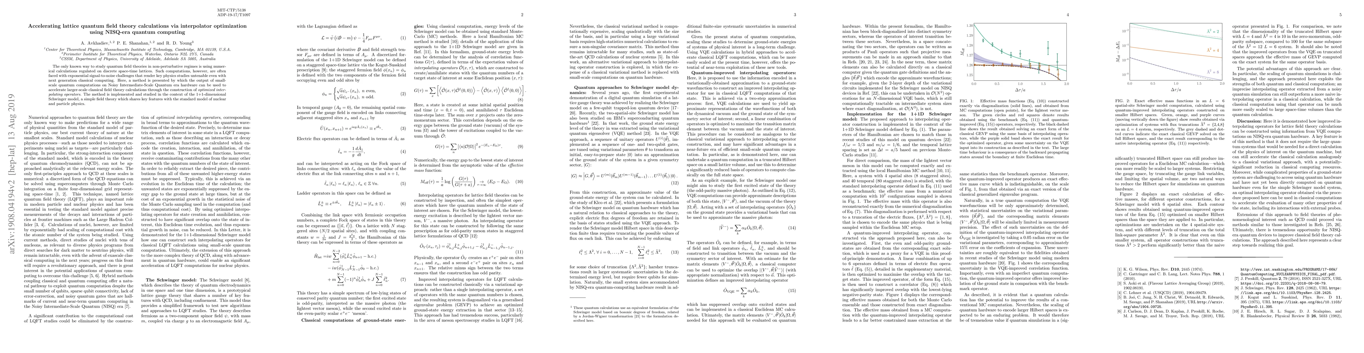 The only known way to study quantum field theories in non-perturbative regimes is using numerical calculations regulated on discrete space-time lattices. Such computations, however, are often faced with exponential signal-to-noise challenges that render key physics studies untenable even with next generation classical computing. Here, a method is presented by which the output of small-scale quantum computations on Noisy Intermediate-Scale Quantum era hardware can be used to accelerate larger-scale classical field theory calculations through the construction of optimized interpolating operators. The method is implemented and studied in the context of the 1+1-dimensional Schwinger model, a simple field theory which shares key features with the standard model of nuclear and particle physics.