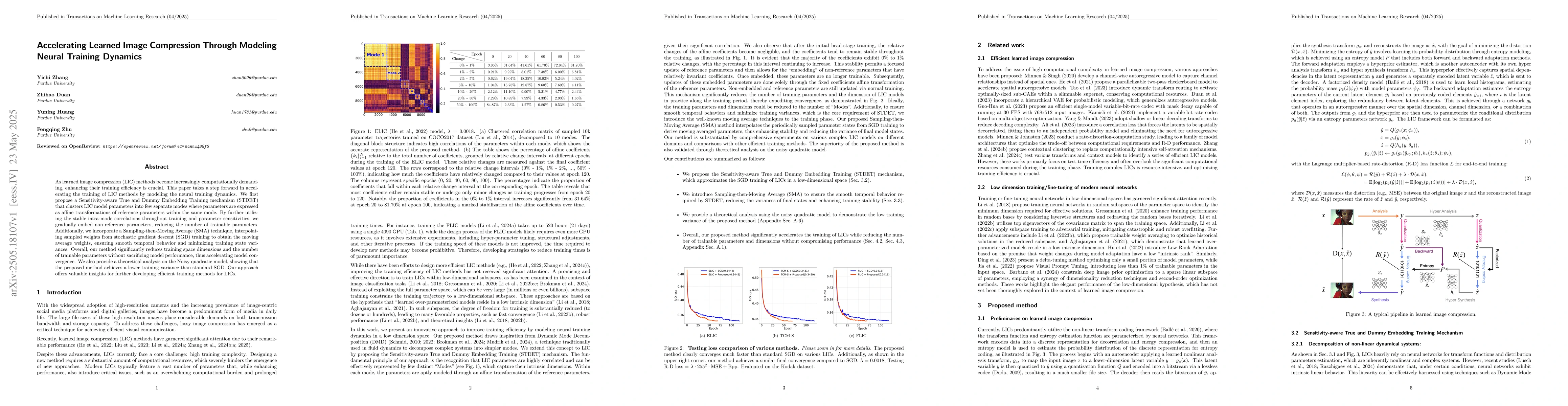 This paper proposes a new method to accelerate learned image compression training by modeling neural training dynamics, reducing trainable parameters without sacrificing performance, and achieving lower training variance than standard methods.