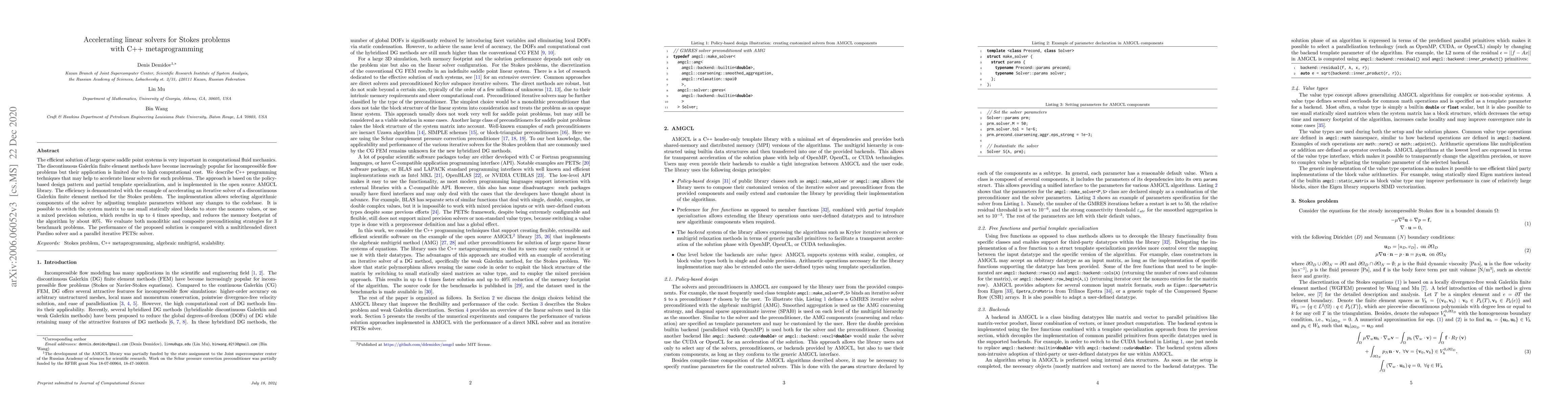 This paper explores C++ metaprogramming techniques to accelerate linear solvers for Stokes problems, specifically using policy-based design and partial template specialization in the AMGCL library. The approach achieves up to 4 times speedup and reduces memory usage by 40% through algorithmic component selection via template parameters.