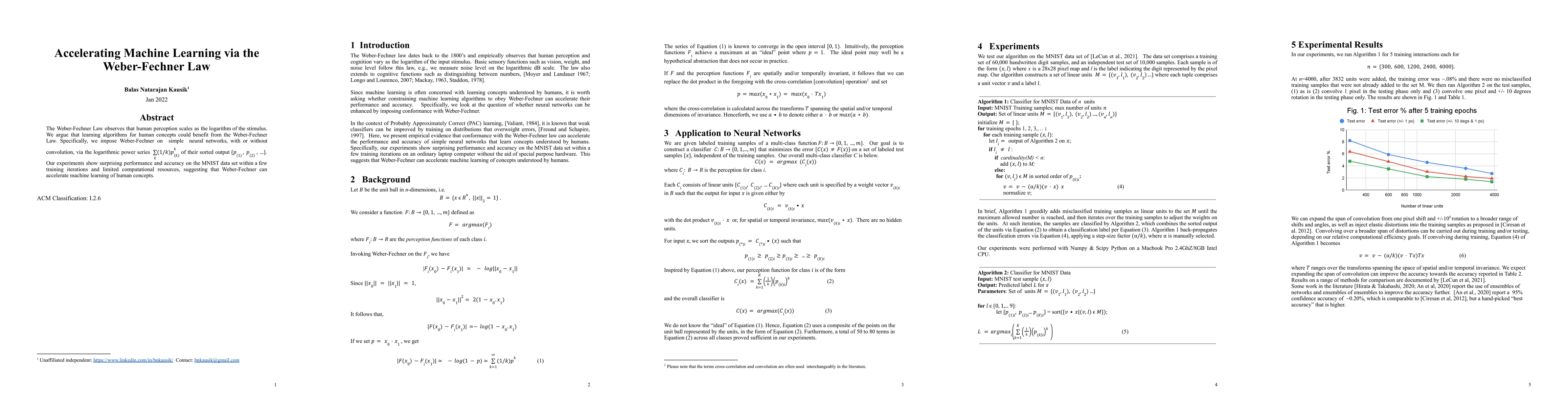 The Weber-Fechner Law observes that human perception scales as the logarithm of the stimulus. We argue that learning algorithms for human concepts could benefit from the Weber-Fechner Law. Specifically, we impose Weber-Fechner on simple neural networks, with or without convolution, via the logarithmic power series of their sorted output. Our experiments show surprising performance and accuracy on the MNIST data set within a few training iterations and limited computational resources, suggesting that Weber-Fechner can accelerate machine learning of human concepts.