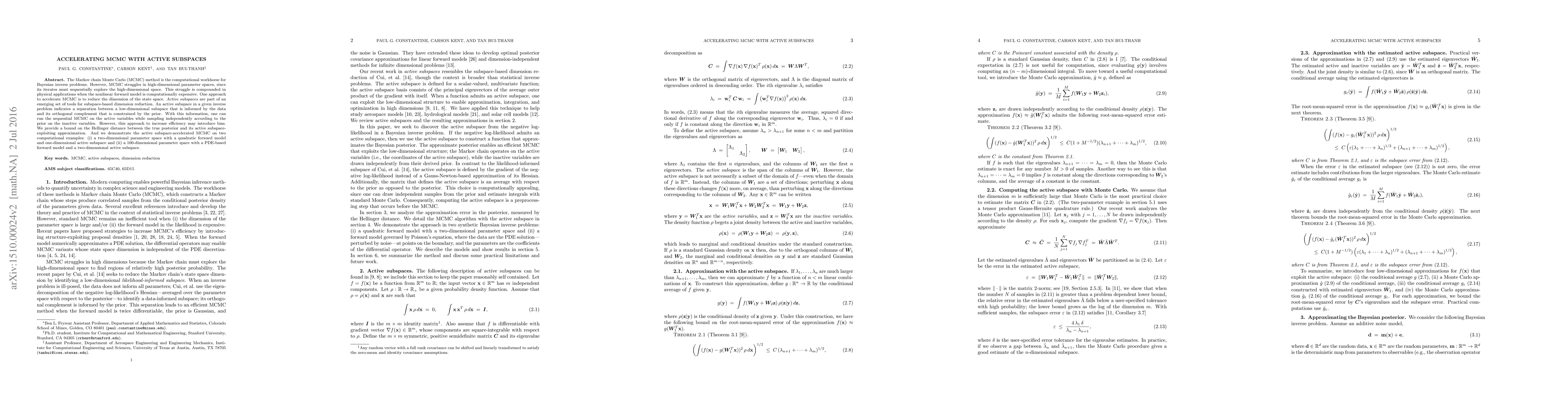 This paper explores using active subspaces to accelerate Markov chain Monte Carlo (MCMC) methods for high-dimensional Bayesian inverse problems. It provides a bound on the bias introduced by this approach and demonstrates its effectiveness on two examples: a two-dimensional problem and a 100-dimensional problem with PDE-based models.