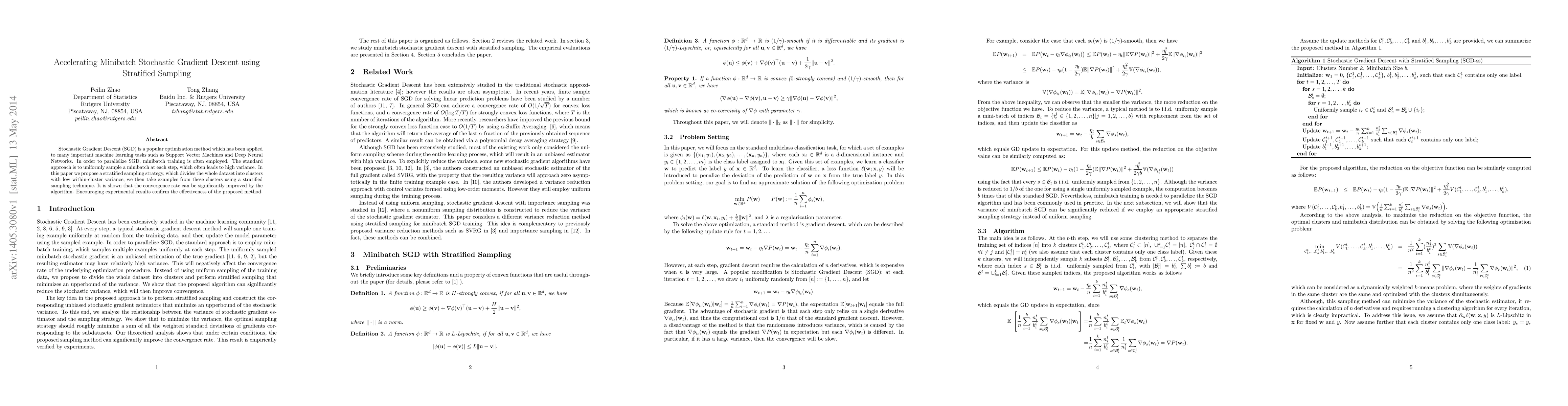 This paper proposes a stratified sampling strategy to improve the convergence rate of minibatch Stochastic Gradient Descent (SGD) by clustering data with low variance and sampling from these clusters. Experimental results show significant improvements over the standard uniform sampling method.
