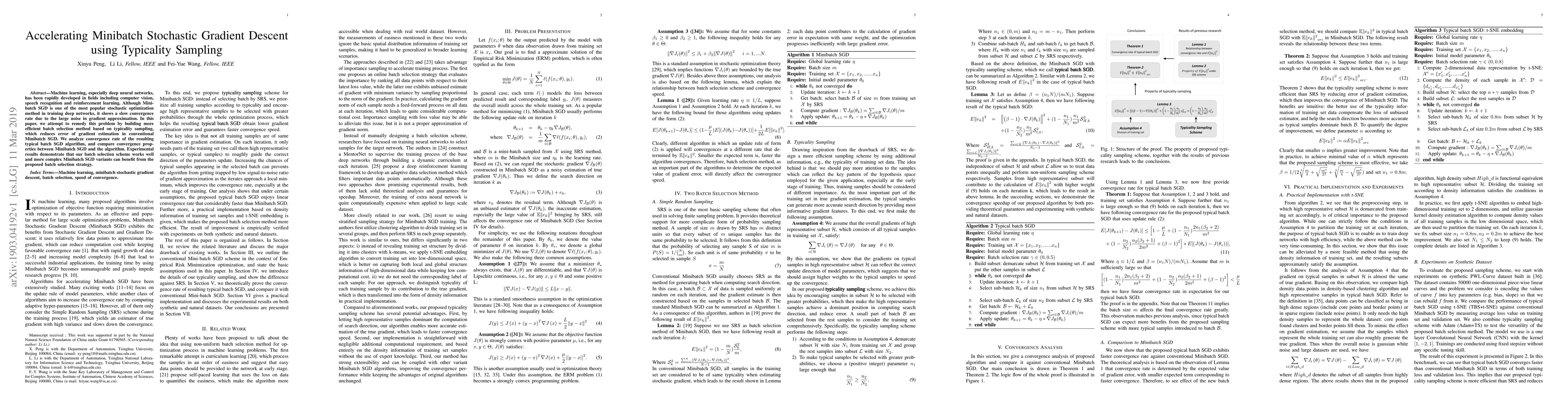 Machine learning, especially deep neural networks, has been rapidly developed in fields including computer vision, speech recognition and reinforcement learning. Although Mini-batch SGD is one of the most popular stochastic optimization methods in training deep networks, it shows a slow convergence rate due to the large noise in gradient approximation. In this paper, we attempt to remedy this problem by building more efficient batch selection method based on typicality sampling, which reduces the error of gradient estimation in conventional Minibatch SGD. We analyze the convergence rate of the resulting typical batch SGD algorithm and compare convergence properties between Minibatch SGD and the algorithm. Experimental results demonstrate that our batch selection scheme works well and more complex Minibatch SGD variants can benefit from the proposed batch selection strategy.