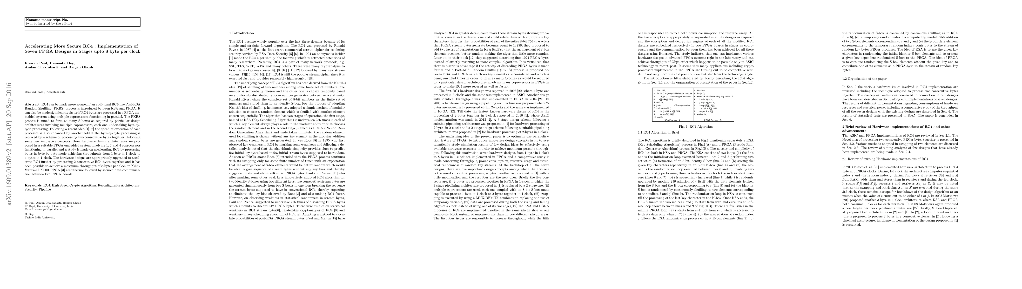 RC4 can be made more secured if an additional RC4-like Post-KSA Random Shuffing (PKRS) process is introduced between KSA and PRGA. It can also be made significantly faster if RC4 bytes are processed in a FPGA embedded system using multiple coprocessors functioning in parallel. The PKRS process is tuned to form as many S-boxes as required by particular design architectures involving multiple coprocessors, each one undertaking byte-by-byte processing. Following a ecent idea [1] [2] the speed of execution of each processor is also enhanced by another fold if the byte-by-byte processing is replaced by a scheme of processing two consecutive bytes together. Adopting some new innovative concepts, three hardware design architectures are proposed in a suitable FPGA embedded system involving 1, 2 and 4 coprocessors functioning in parallel and a study is made on accelerating RC4 by processing bytes in byte-by-byte mode achieving throughputs from 1-byte-in-1-clock to 4-bytes-in-1-clock. The hardware designs are appropriately upgraded to accelerate RC4 further by processing 2 onsecutive RC4 bytes together and it has been possible to achieve a maximum throughput of 8-bytes per clock in Xilinx Virtex-5 LX110t FPGA [3] architecture followed by secured data communication between two FPGA boards.