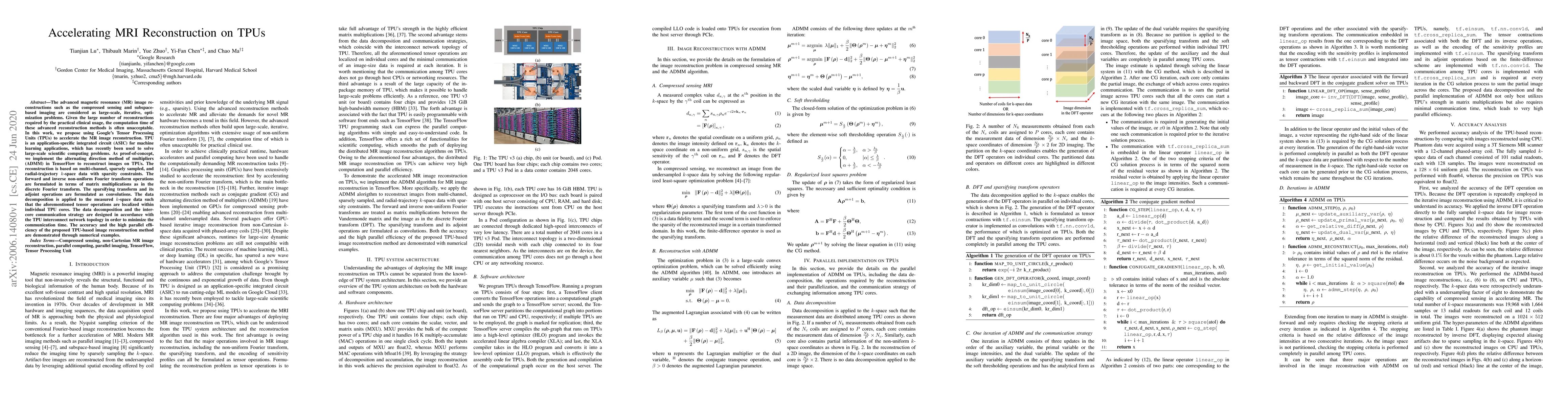 This paper proposes using Google's Tensor Processing Units (TPUs) to accelerate advanced MRI reconstruction methods, specifically implementing the ADMM algorithm in TensorFlow. The method minimizes communication time by decomposing data and optimizing tensor operations to leverage TPU cores efficiently, demonstrating high parallel efficiency and accuracy.