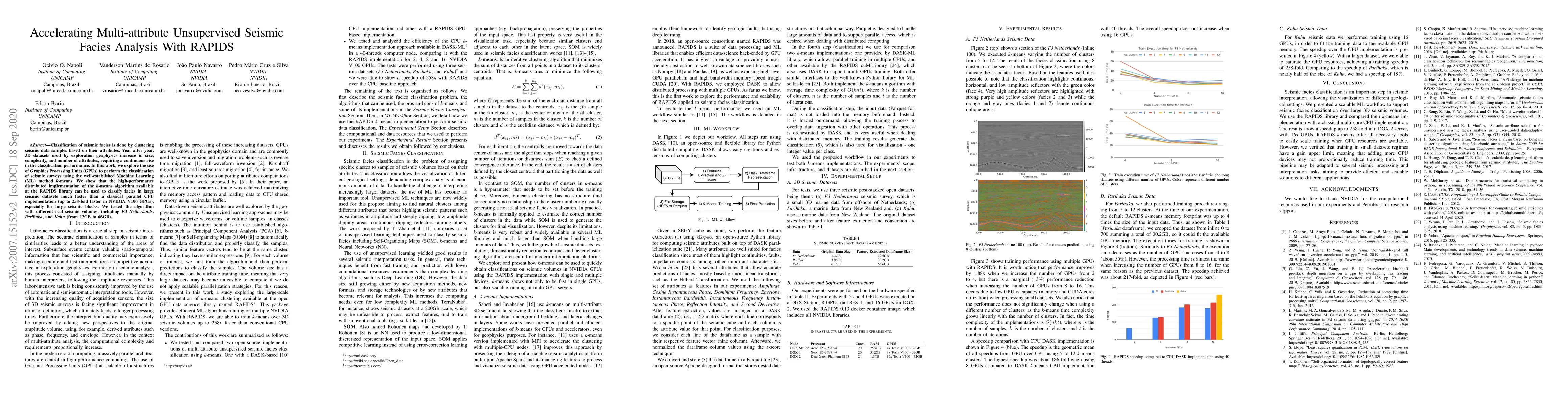 This paper investigates the use of GPUs via the RAPIDS library to accelerate k-means clustering for classifying seismic facies in large, complex datasets. The study demonstrates significant speedups (up to 258-fold) compared to traditional parallel CPU implementations, particularly for extensive seismic blocks.
