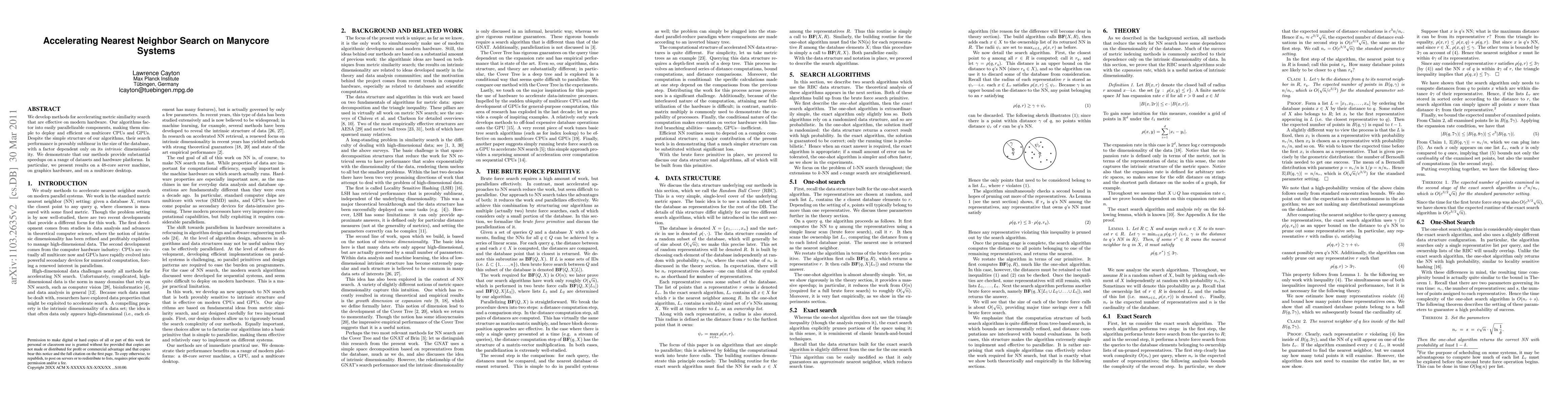 We develop methods for accelerating metric similarity search that are effective on modern hardware. Our algorithms factor into easily parallelizable components, making them simple to deploy and efficient on multicore CPUs and GPUs. Despite the simple structure of our algorithms, their search performance is provably sublinear in the size of the database, with a factor dependent only on its intrinsic dimensionality. We demonstrate that our methods provide substantial speedups on a range of datasets and hardware platforms. In particular, we present results on a 48-core server machine, on graphics hardware, and on a multicore desktop.