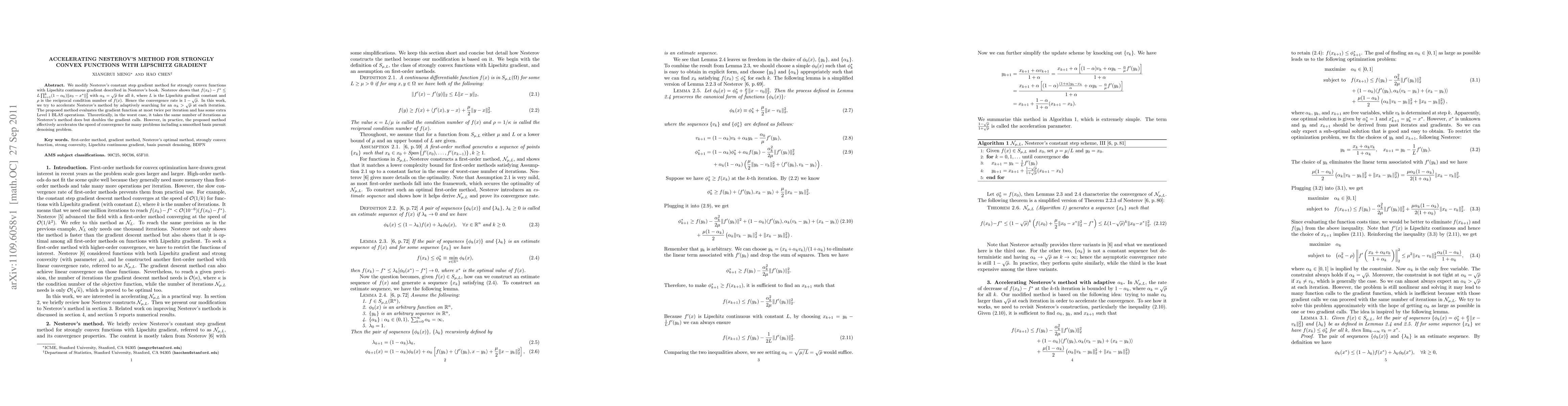We modify Nesterov's constant step gradient method for strongly convex functions with Lipschitz continuous gradient described in Nesterov's book. Nesterov shows that $f(x_k) - f^* \leq L \prod_{i=1}^k (1 - \alpha_k) \| x_0 - x^* \|_2^2$ with $\alpha_k = \sqrt{\rho}$ for all $k$, where $L$ is the Lipschitz gradient constant and $\rho$ is the reciprocal condition number of $f(x)$. Hence the convergence rate is $1-\sqrt{\rho}$. In this work, we try to accelerate Nesterov's method by adaptively searching for an $\alpha_k > \sqrt{\rho}$ at each iteration. The proposed method evaluates the gradient function at most twice per iteration and has some extra Level 1 BLAS operations. Theoretically, in the worst case, it takes the same number of iterations as Nesterov's method does but doubles the gradient calls. However, in practice, the proposed method effectively accelerates the speed of convergence for many problems including a smoothed basis pursuit denoising problem.