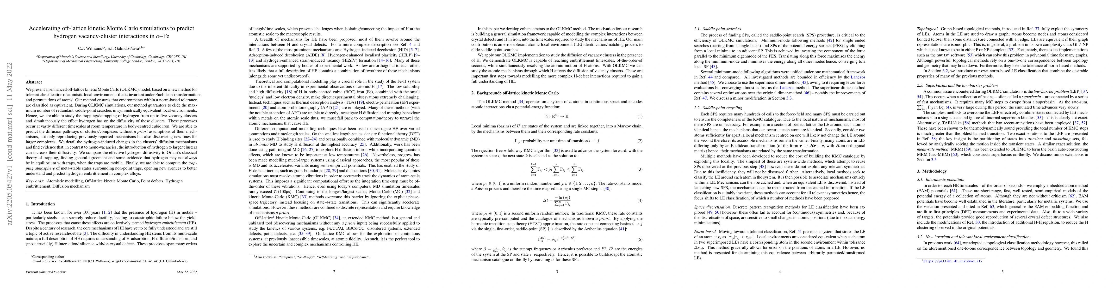 This paper introduces an advanced off-lattice kinetic Monte Carlo model to predict hydrogen vacancy-cluster interactions in α-Fe, utilizing a novel classification method to reduce redundant calculations. The model reveals that hydrogen can enhance the diffusivity of larger vacancy clusters, challenging traditional trapping theories and offering insights into hydrogen embrittlement mechanisms.
