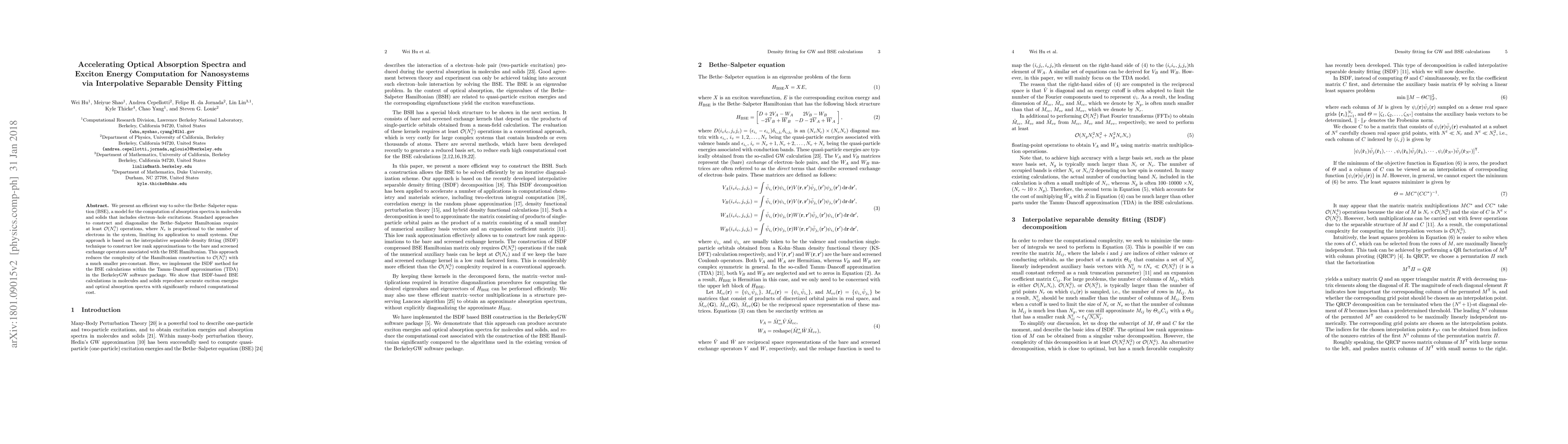 This paper presents an efficient method using interpolative separable density fitting (ISDF) to solve the Bethe-Salpeter equation (BSE), significantly reducing the computational complexity from $\O(N_e^5)$ to $\O(N_e^3)$ for calculating optical absorption spectra and exciton energies in nanosystems. The ISDF approach is implemented within the BerkeleyGW software package, demonstrating accurate results with lower computational costs.