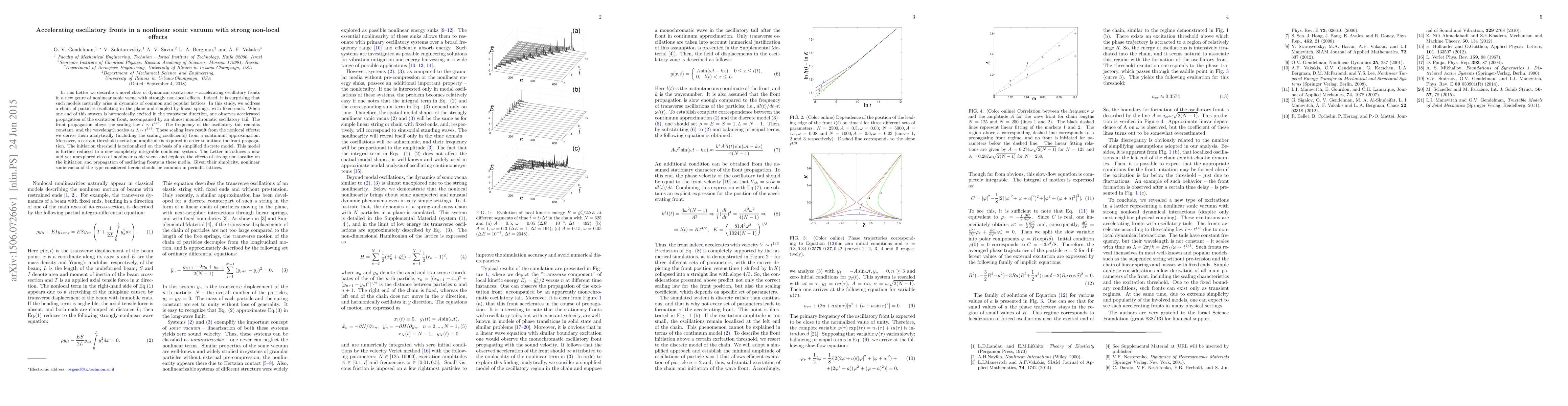 In this Letter we describe a novel class of dynamical excitations -- accelerating oscillatory fronts in a new genre of nonlinear sonic vacua with strongly non-local effects. Indeed, it is surprising that such models naturally arise in dynamics of common and popular lattices. In this study, we address a chain of particles oscillating in the plane and coupled by linear springs, with fixed ends. When one end of this system is harmonically excited in the transverse direction, one observes accelerated propagation of the excitation front, accompanied by an almost monochromatic oscillatory tail. The front propagation obeys the scaling law $l \sim t^{4/3}$. The frequency of the oscillatory tail remains constant, and the wavelength scales as $\lambda \sim t^{1/3}$. These scaling laws result from the nonlocal effects; we derive them analytically (including the scaling coefficients) from a continuum approximation. Moreover, a certain threshold excitation amplitude is required in order to initiate the front propagation. The initiation threshold is rationalized on the basis of a simplified discrete model. This model is further reduced to a new completely integrable nonlinear system. The Letter introduces a new and yet unexplored class of nonlinear sonic vacua and explores the effects of strong non-locality on the initiation and propagation of oscillating fronts in these media. Given their simplicity, nonlinear sonic vacua of the type considered herein should be common in periodic lattices.
