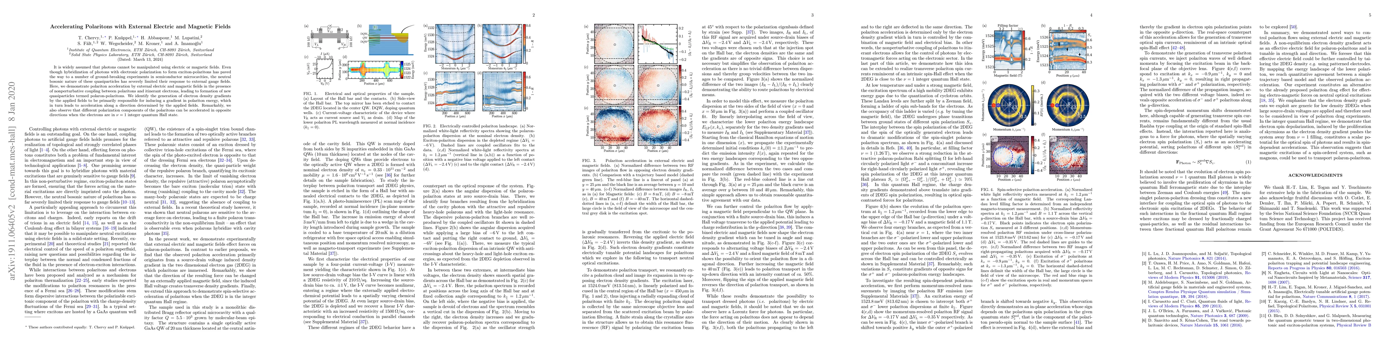 It is widely assumed that photons cannot be manipulated using electric or magnetic fields. Even though hybridization of photons with electronic polarization to form exciton-polaritons has paved the way to a number of ground-breaking experiments in semiconductor microcavities, the neutral bosonic nature of these quasiparticles has severely limited their response to external gauge fields. Here, we demonstrate polariton acceleration by external electric and magnetic fields in the presence of nonperturbative coupling between polaritons and itinerant electrons, leading to formation of new quasiparticles termed polaron-polaritons. We identify the generation of electron density gradients by the applied fields to be primarily responsible for inducing a gradient in polariton energy, which in turn leads to acceleration along a direction determined by the applied fields. Remarkably, we also observe that different polarization components of the polaritons can be accelerated in opposite directions when the electrons are in $\nu = 1$ integer quantum Hall state.