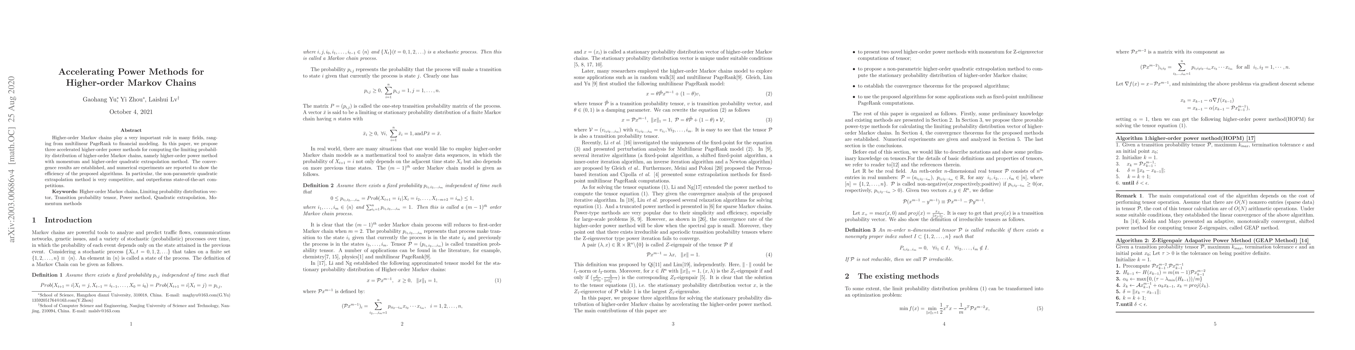 This paper introduces three accelerated higher-order power methods for computing the limiting probability distribution of higher-order Markov chains, including momentum-based and quadratic extrapolation techniques. The proposed methods demonstrate superior efficiency and convergence compared to existing methods, particularly the non-parametric quadratic extrapolation method.