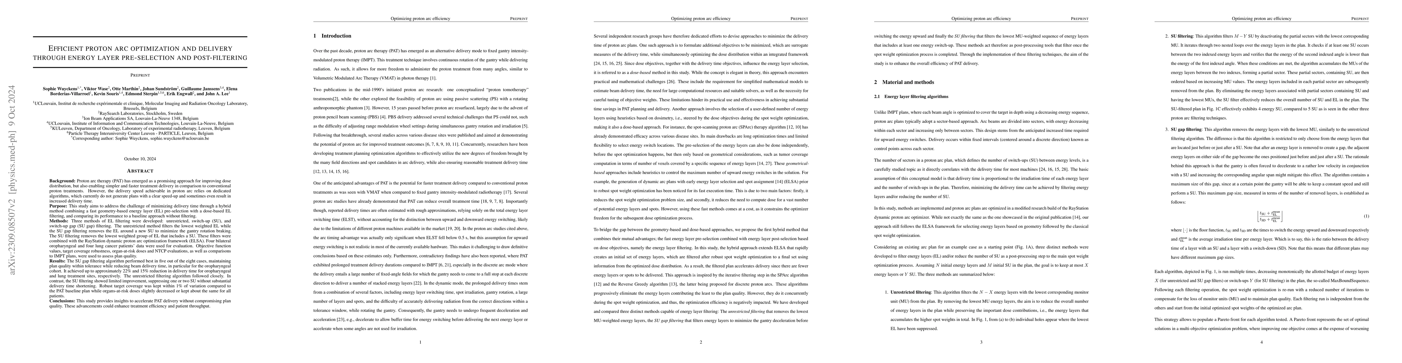 Proton arc therapy has emerged as a promising approach for faster treatment delivery in comparison to conventional proton treatments. However, unexpected prolonged treatment times in several proton arc planning studies have raised concerns. In this study, we aim to address the challenge of minimizing delivery time through dosimetry-guided energy layer filtering, comparing its performance to a baseline approach without filtering. We developed three methods of energy layer (EL) filtering: unrestricted, switch-up (SU), and switch-up gap (SU gap) filtering. The unrestricted method filters the lowest weighted EL while the SU gap filtering removes in priority the EL around a new SU to minimize the gantry rotation braking. The SU filtering removes the lowest weighted group of EL that includes a SU. These post-processing filters were used in conjunction with the RayStation dynamic proton arc optimization framework (ELSA). Four bilateral oropharyngeal cancer patients' data were used for evaluation. Objective function values, target coverage robustness, organ-at-risk doses and NTCP evaluations, as well as comparisons to IMPT plans, were used to assess plan quality. The SU gap filtering algorithm performed best in three out of the four cases, maintaining plan quality within tolerance while significantly reducing beam delivery time. It achieved up to approximately 22% reduction in delivery time. The unrestricted filtering algorithm followed closely. In contrast, the SU filtering showed limited improvement, suppressing hardly a few SU without substantial delivery time shortening. Robust target coverage was kept within 1% of variation compared to the ELSA baseline plan while OAR doses slighlty decreased in all four patients. Both arc plans present large reductions in NTCP values for dysphagia and xerostomia compared to the reference IMPT plan.