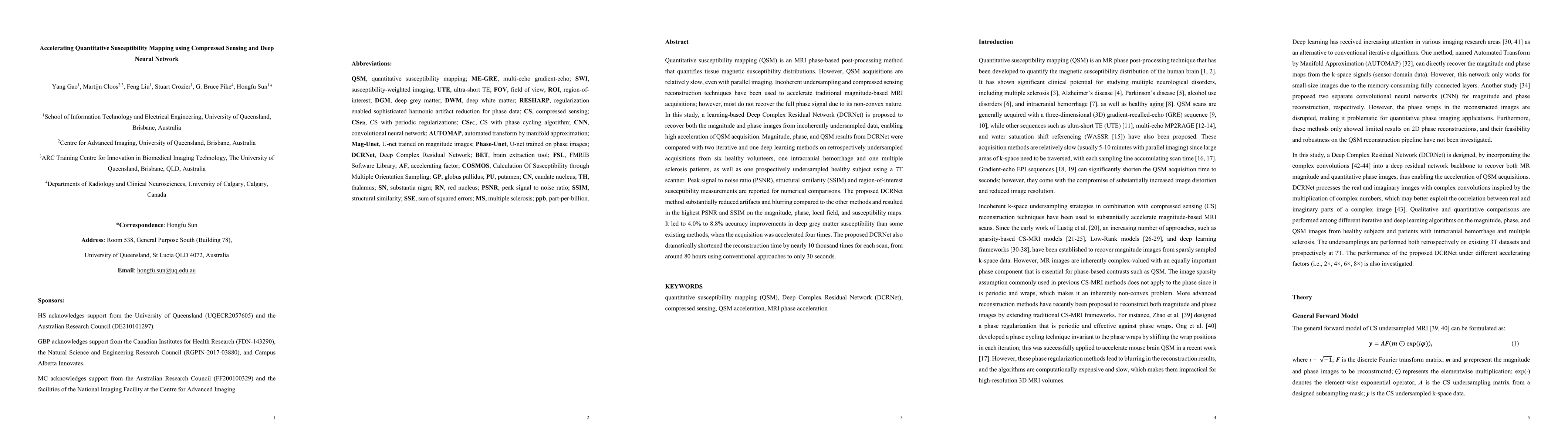 This study proposes a Deep Complex Residual Network (DCRNet) to accelerate Quantitative Susceptibility Mapping (QSM) using compressed sensing and deep learning. The DCRNet method significantly reduces artifacts and improves reconstruction accuracy, achieving 4.0% to 8.8% better susceptibility measurements in deep grey matter compared to other methods, while reducing reconstruction time from 80 hours to just 30 seconds.