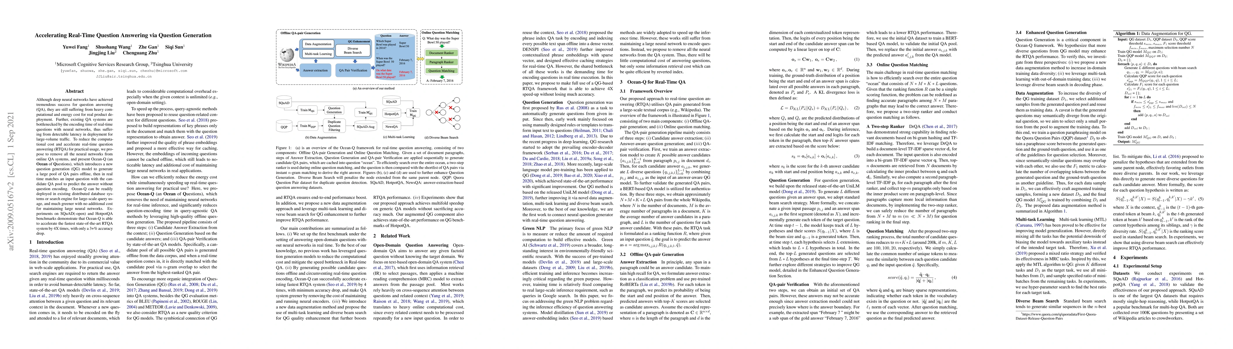 This paper proposes Ocean-Q, a method to accelerate real-time question answering by generating a large pool of QA pairs offline and matching real-time questions to this pool, thus eliminating the need for neural network encoding. Ocean-Q significantly reduces computational costs and latency, achieving up to 4X speedup with minimal loss in accuracy.