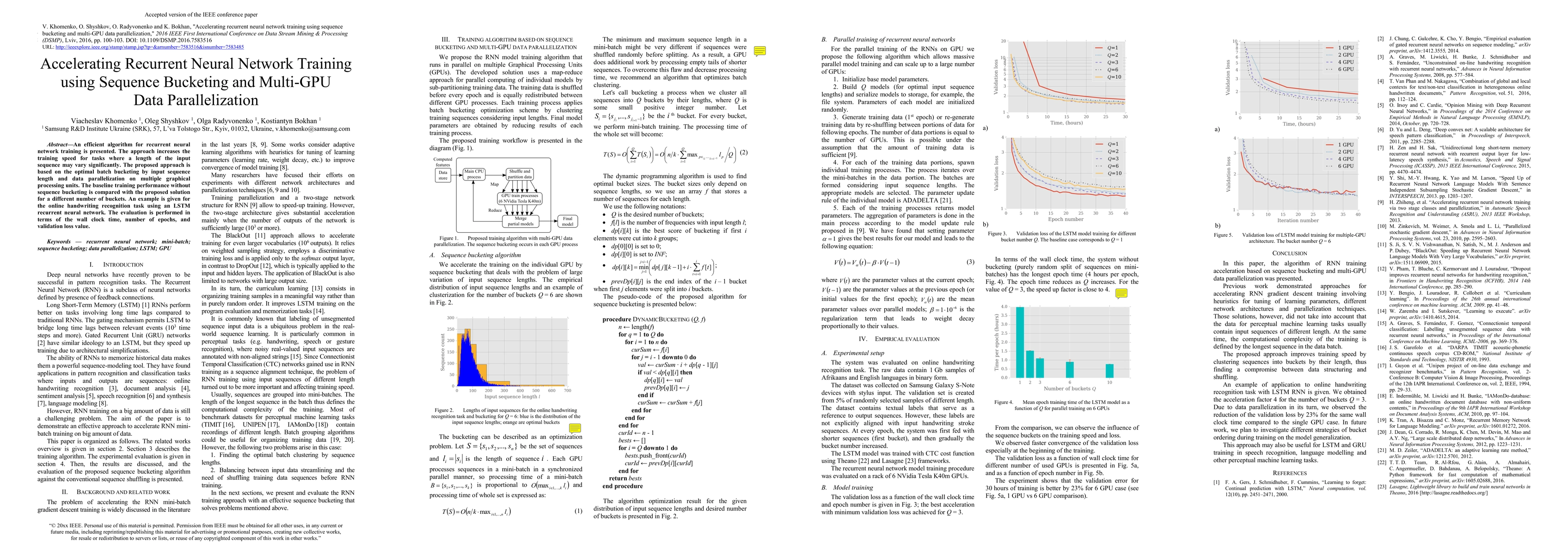 This paper proposes an efficient training method for recurrent neural networks that uses sequence bucketing and multi-GPU data parallelization to speed up training, especially for tasks with variable input sequence lengths. The method is evaluated against a baseline on an online handwriting recognition task, showing improved wall clock time and validation loss.